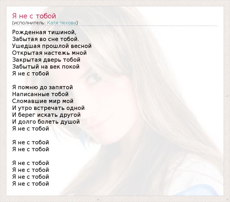 Рожденная тишиной, Забытая во сне тобой. Ушедшая прошлой весной Открытая настежь мной Закрытая дверь тобой Забытый на век покой Я не с тобой Я помню до запятой Написанные тобой Сломавшие мир мой И утро встречать одной И берег искать другой И долго болеть душой Я не с тобой Я не с тобой Я не с тобой Я не с тобой Я не с тобой Я не с тобой Я не с тобой
