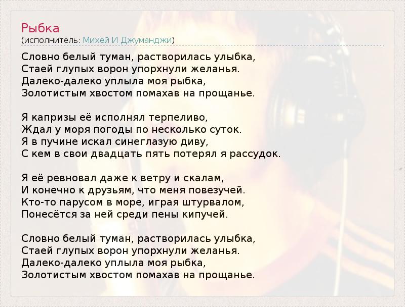 Словно белый туман, растворилась улыбка, Стаей глупых ворон упорхнули желанья. Далеко-далеко уплыла моя рыбка, Золотистым хвостом помахав на прощанье. Я капризы её исполнял терпеливо, Ждал у моря погоды по несколько суток. Я в пучине искал синеглазую диву, С кем в свои двадцать пять потерял я рассудок. Я её ревновал даже к ветру и скалам, И конечно к друзьям, что меня повезучей. Кто-то парусом в море, играя штурвалом, Понесётся за ней среди пены кипучей. Словно белый туман, растворилась улыбка, Стаей глупых ворон упорхнули желанья. Далеко-далеко уплыла моя рыбка, Золотистым хвостом помахав на прощанье.