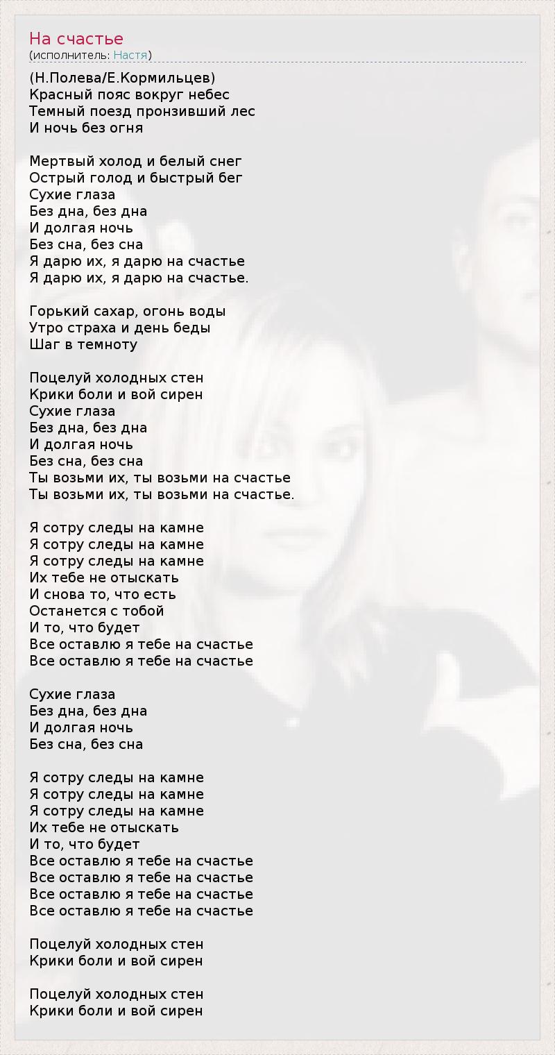 (Н.Полева/Е.Кормильцев) Красный пояс вокруг небес Темный поезд пронзивший лес И ночь без огня Мертвый холод и белый снег Острый голод и быстрый бег Сухие глаза Без дна, без дна И долгая ночь Без сна, без сна Я дарю их, я дарю на счастье Я дарю их, я дарю на счастье. Горький сахар, огонь воды Утро страха и день беды Шаг в темноту Поцелуй холодных стен Крики боли и вой сирен Сухие глаза Без дна, без дна И долгая ночь Без сна, без сна Ты возьми их, ты возьми на счастье Ты возьми их, ты возьми на счастье. Я сотру следы на камне Я сотру следы на камне Я сотру следы на камне Их тебе не отыскать И снова то, что есть Останется с тобой И то, что будет Все оставлю я тебе на счастье Все оставлю я тебе на счастье Сухие глаза Без дна, без дна И долгая ночь Без сна, без сна Я сотру следы на камне Я сотру следы на камне Я сотру следы на камне Их тебе не отыскать И то, что будет Все оставлю я тебе на счастье Все оставлю я тебе на счастье Все оставлю я тебе на счастье Все оставлю я тебе на счастье Поцелуй холодных стен Крики боли и вой сирен Поцелуй холодных стен Крики боли и вой сирен