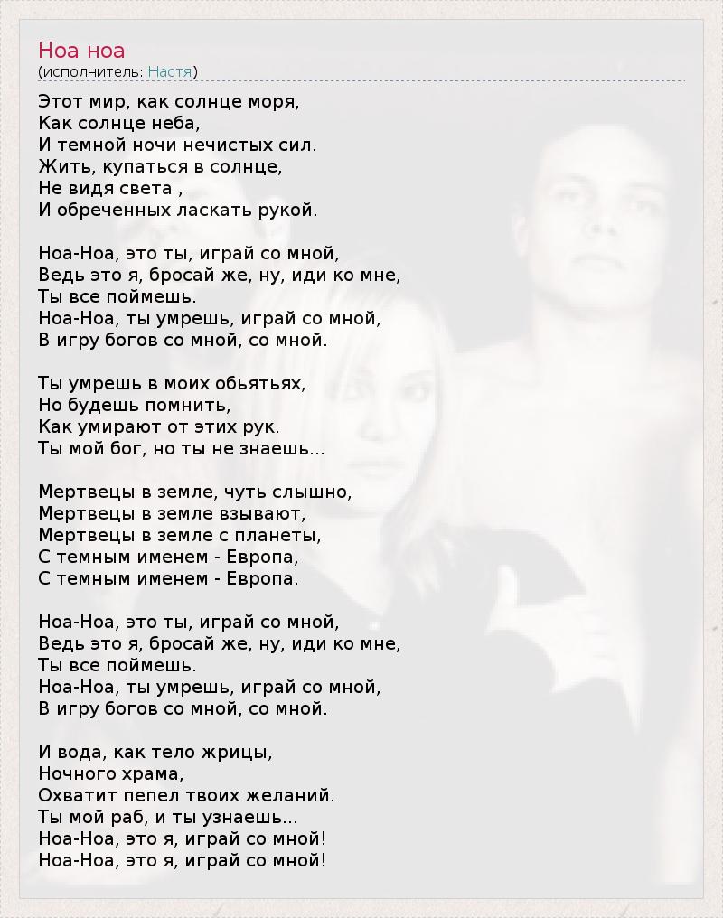 Этот мир, как солнце моря, Как солнце неба, И темной ночи нечистых сил. Жить, купаться в солнце, Не видя света , И обреченных ласкать рукой. Ноа-Ноа, это ты, играй со мной, Ведь это я, бросай же, ну, иди ко мне, Ты все поймешь. Ноа-Ноа, ты умрешь, играй со мной, В игру богов со мной, со мной. Ты умрешь в моих обьятьях, Но будешь помнить, Как умирают от этих рук. Ты мой бог, но ты не знаешь... Мертвецы в земле, чуть слышно, Мертвецы в земле взывают, Мертвецы в земле с планеты, С темным именем - Европа, С темным именем - Европа. Ноа-Ноа, это ты, играй со мной, Ведь это я, бросай же, ну, иди ко мне, Ты все поймешь. Ноа-Ноа, ты умрешь, играй со мной, В игру богов со мной, со мной. И вода, как тело жрицы, Ночного храма, Охватит пепел твоих желаний. Ты мой раб, и ты узнаешь... Ноа-Ноа, это я, играй со мной! Ноа-Ноа, это я, играй со мной!