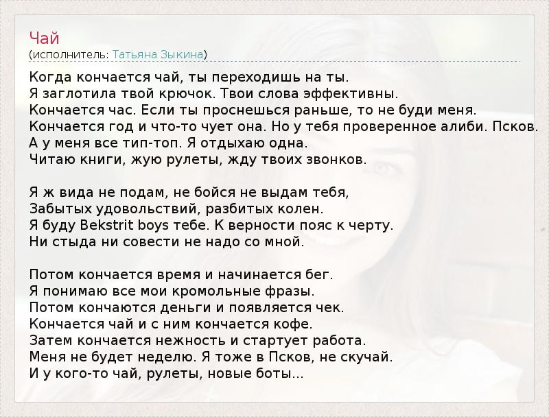 Когда кончается чай, ты переходишь на ты. Я заглотила твой крючок. Твои слова эффективны. Кончается час. Если ты проснешься раньше, то не буди меня. Кончается год и что-то чует она. Но у тебя проверенное алиби. Псков. А у меня все тип-топ. Я отдыхаю одна. Читаю книги, жую рулеты, жду твоих звонков. Я ж вида не подам, не бойся не выдам тебя, Забытых удовольствий, разбитых колен. Я буду Bekstrit boys тебе. К верности пояс к черту. Ни стыда ни совести не надо со мной. Потом кончается время и начинается бег. Я понимаю все мои кромольные фразы. Потом кончаются деньги и появляется чек. Кончается чай и с ним кончается кофе. Затем кончается нежность и стартует работа. Меня не будет неделю. Я тоже в Псков, не скучай. И у кого-то чай, рулеты, новые боты...