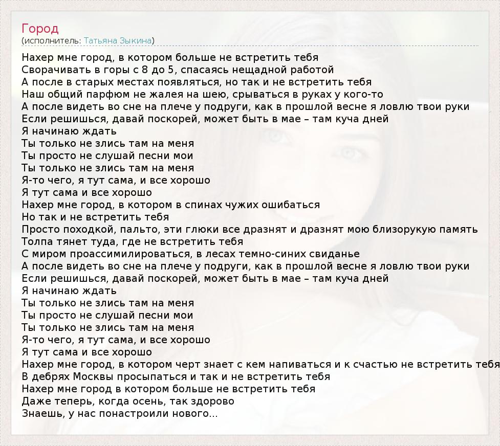 Нахер мне город, в котором больше не встретить тебя Сворачивать в горы с 8 до 5, спасаясь нещадной работой А после в старых местах появляться, но так и не встретить тебя Наш общий парфюм не жалея на шею, срываться в руках у кого-то А после видеть во сне на плече у подруги, как в прошлой весне я ловлю твои руки Если решишься, давай поскорей, может быть в мае – там куча дней Я начинаю ждать Ты только не злись там на меня Ты просто не слушай песни мои Ты только не злись там на меня Я-то чего, я тут сама, и все хорошо Я тут сама и все хорошо Нахер мне город, в котором в спинах чужих ошибаться Но так и не встретить тебя Просто походкой, пальто, эти глюки все дразнят и дразнят мою близорукую память Толпа тянет туда, где не встретить тебя С миром проассимилироваться, в лесах темно-синих свиданье А после видеть во сне на плече у подруги, как в прошлой весне я ловлю твои руки Если решишься, давай поскорей, может быть в мае – там куча дней Я начинаю ждать Ты только не злись там на меня Ты просто не слушай песни мои Ты только не злись там на меня Я-то чего, я тут сама, и все хорошо Я тут сама и все хорошо Нахер мне город, в котором черт знает с кем напиваться и к счастью не встретить тебя В дебрях Москвы просыпаться и так и не встретить тебя Нахер мне город в котором больше не встретить тебя Даже теперь, когда осень, так здорово Знаешь, у нас понастроили нового...