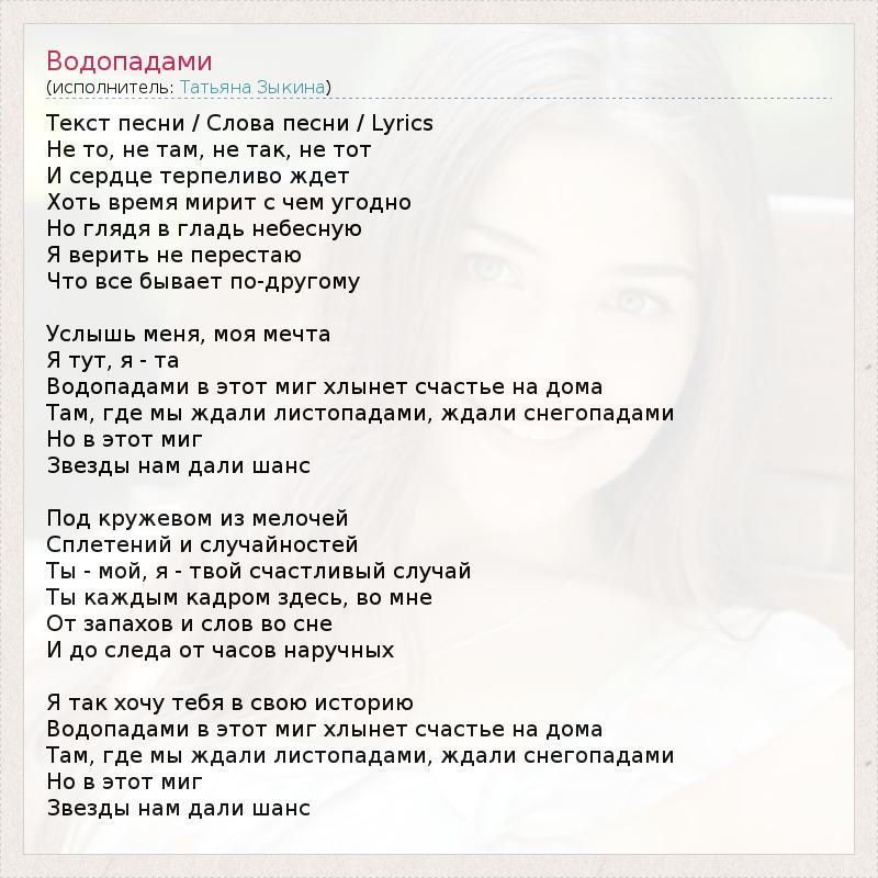 Текст песни / Слова песни / Lyrics Не то, не там, не так, не тот И сердце терпеливо ждет Хоть время мирит с чем угодно Но глядя в гладь небесную Я верить не перестаю Что все бывает по-другому Услышь меня, моя мечта Я тут, я - та Водопадами в этот миг хлынет счастье на дома Там, где мы ждали листопадами, ждали снегопадами Но в этот миг Звезды нам дали шанс Под кружевом из мелочей Сплетений и случайностей Ты - мой, я - твой счастливый случай Ты каждым кадром здесь, во мне От запахов и слов во сне И до следа от часов наручных Я так хочу тебя в свою историю Водопадами в этот миг хлынет счастье на дома Там, где мы ждали листопадами, ждали снегопадами Но в этот миг Звезды нам дали шанс