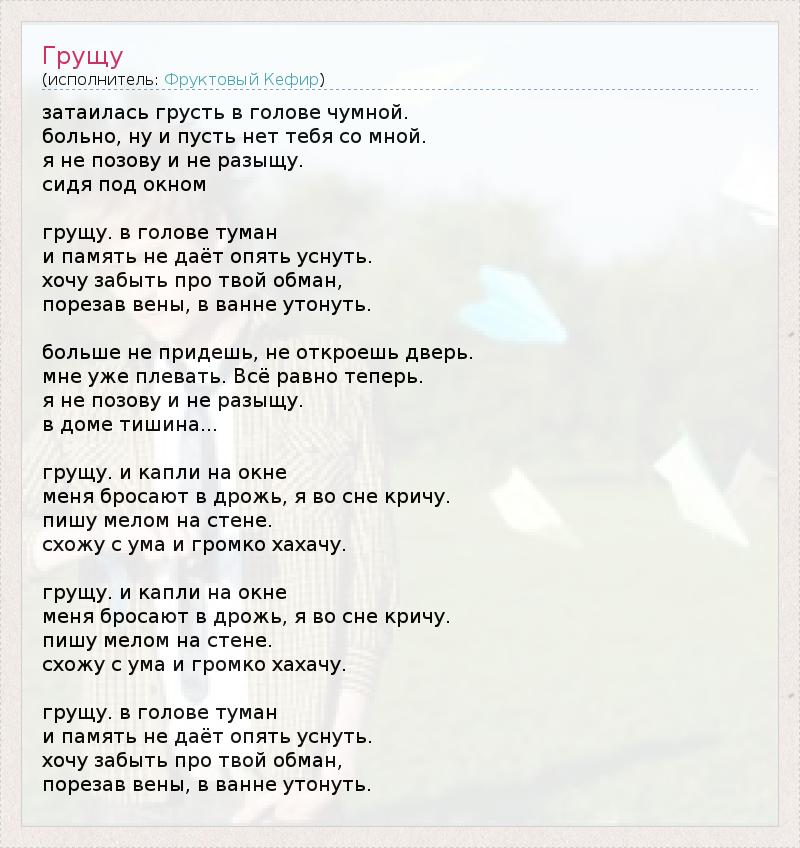 hold the sadness in my head plague. hurt, well, let no you with me. I do not call and do not разыщу. sitting under the window грущу. in the head of the fog and memory does not give to fall back asleep. I want to forget about your deception cut the veins, in the bathroom sink. more don't come, you will not open the door. I have to spit. It is now. I do not call and do not разыщу. in the house of silence... грущу. and the drops on the window me throwing the creeps, I'm in a dream scream. writing with chalk on the wall. going crazy and loud хахачу. грущу. and the drops on the window me throwing the creeps, I'm in a dream scream. writing with chalk on the wall. going crazy and loud хахачу. грущу. in the head of the fog and memory does not give to fall back asleep. I want to forget about your deception cut the veins, in the bathroom sink.