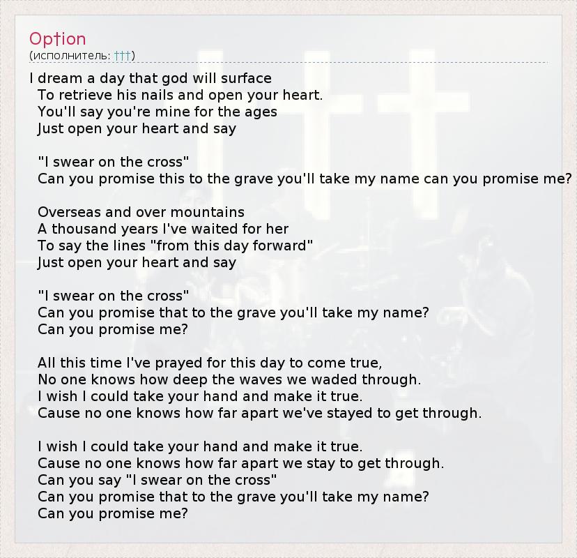 I dream a day that god will surface To retrieve his nails and open your heart. You'll say you're mine for the ages Just open your heart and say "I swear on the cross" Can you promise this to the grave you'll take my name can you promise me? Overseas and over mountains A thousand years I've waited for her To say the lines "from this day forward" Just open your heart and say "I swear on the cross" Can you promise that to the grave you'll take my name? Can you promise me? All this time I've prayed for this day to come true, No one knows how deep the waves we waded through. I wish I could take your hand and make it true. Cause no one knows how far apart we've stayed to get through. I wish I could take your hand and make it true. Cause no one knows how far apart we stay to get through. Can you say "I swear on the cross" Can you promise that to the grave you'll take my name? Can you promise me?