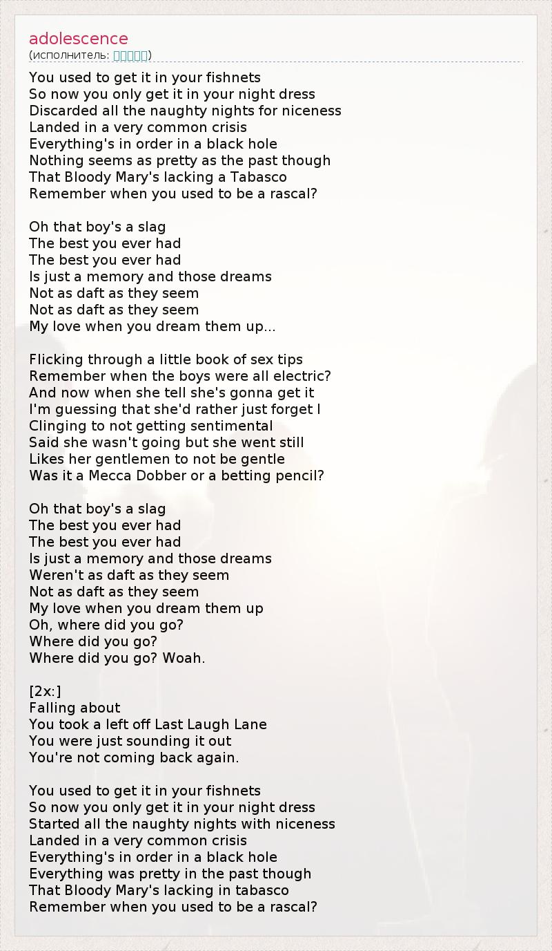 You used to get it in your fishnets So now you only get it in your night dress Discarded all the naughty nights for niceness Landed in a very common crisis Everything's in order in a black hole Nothing seems as pretty as the past though That Bloody Mary's lacking a Tabasco Remember when you used to be a rascal? Oh that boy's a slag The best you ever had The best you ever had Is just a memory and those dreams Not as daft as they seem Not as daft as they seem My love when you dream them up... Flicking through a little book of sex tips Remember when the boys were all electric? And now when she tell she's gonna get it I'm guessing that she'd rather just forget I Clinging to not getting sentimental Said she wasn't going but she went still Likes her gentlemen to not be gentle Was it a Mecca Dobber or a betting pencil? Oh that boy's a slag The best you ever had The best you ever had Is just a memory and those dreams Weren't as daft as they seem Not as daft as they seem My love when you dream them up Oh, where did you go? Where did you go? Where did you go? Woah. [2x:] Falling about You took a left off Last Laugh Lane You were just sounding it out You're not coming back again. You used to get it in your fishnets So now you only get it in your night dress Started all the naughty nights with niceness Landed in a very common crisis Everything's in order in a black hole Everything was pretty in the past though That Bloody Mary's lacking in tabasco Remember when you used to be a rascal?