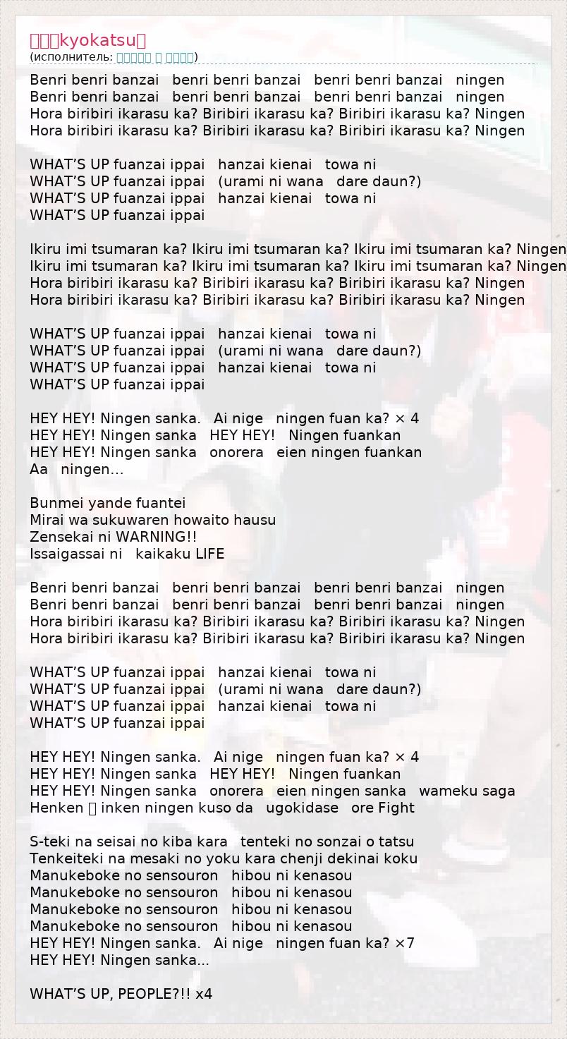 Benri benri banzai benri benri banzai benri benri banzai ningen Benri benri banzai benri benri banzai benri benri banzai ningen Hora biribiri ikarasu ka? Biribiri ikarasu ka? Biribiri ikarasu ka? Ningen Hora biribiri ikarasu ka? Biribiri ikarasu ka? Biribiri ikarasu ka? Ningen WHAT’S UP fuanzai ippai hanzai kienai towa ni WHAT’S UP fuanzai ippai (urami ni wana dare daun?) WHAT’S UP fuanzai ippai hanzai kienai towa ni WHAT’S UP fuanzai ippai Ikiru imi tsumaran ka? Ikiru imi tsumaran ka? Ikiru imi tsumaran ka? Ningen Ikiru imi tsumaran ka? Ikiru imi tsumaran ka? Ikiru imi tsumaran ka? Ningen Hora biribiri ikarasu ka? Biribiri ikarasu ka? Biribiri ikarasu ka? Ningen Hora biribiri ikarasu ka? Biribiri ikarasu ka? Biribiri ikarasu ka? Ningen WHAT’S UP fuanzai ippai hanzai kienai towa ni WHAT’S UP fuanzai ippai (urami ni wana dare daun?) WHAT’S UP fuanzai ippai hanzai kienai towa ni WHAT’S UP fuanzai ippai HEY HEY! Ningen sanka. Ai nige ningen fuan ka? × 4 HEY HEY! Ningen sanka HEY HEY! Ningen fuankan HEY HEY! Ningen sanka onorera eien ningen fuankan Aa ningen… Bunmei yande fuantei Mirai wa sukuwaren howaito hausu Zensekai ni WARNING!! Issaigassai ni kaikaku LIFE Benri benri banzai benri benri banzai benri benri banzai ningen Benri benri banzai benri benri banzai benri benri banzai ningen Hora biribiri ikarasu ka? Biribiri ikarasu ka? Biribiri ikarasu ka? Ningen Hora biribiri ikarasu ka? Biribiri ikarasu ka? Biribiri ikarasu ka? Ningen WHAT’S UP fuanzai ippai hanzai kienai towa ni WHAT’S UP fuanzai ippai (urami ni wana dare daun?) WHAT’S UP fuanzai ippai hanzai kienai towa ni WHAT’S UP fuanzai ippai HEY HEY! Ningen sanka. Ai nige ningen fuan ka? × 4 HEY HEY! Ningen sanka HEY HEY! Ningen fuankan HEY HEY! Ningen sanka onorera eien ningen sanka wameku saga Henken ・ inken ningen kuso da ugokidase ore Fight S-teki na seisai no kiba kara tenteki no sonzai o tatsu Tenkeiteki na mesaki no yoku kara chenji dekinai koku Manukeboke no sensouron hibou ni kenasou Manukeboke no sensouron hibou ni kenasou Manukeboke no sensouron hibou ni kenasou Manukeboke no sensouron hibou ni kenasou HEY HEY! Ningen sanka. Ai nige ningen fuan ka? ×7 HEY HEY! Ningen sanka... WHAT’S UP, PEOPLE?!! x4