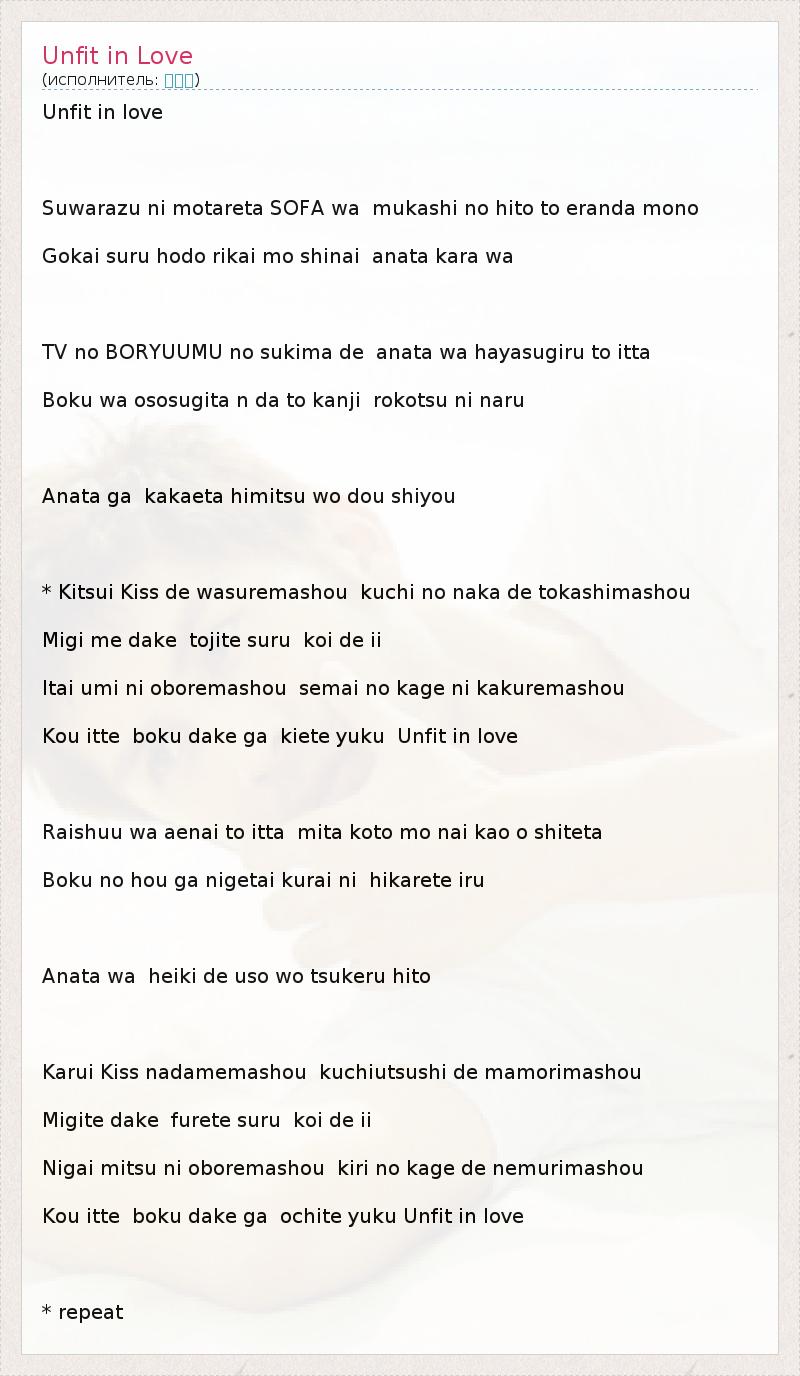 Unfit in love Suwarazu ni motareta SOFA wa mukashi no hito to eranda mono Gokai suru hodo rikai mo shinai anata kara wa TV no BORYUUMU no sukima de anata wa hayasugiru to itta Boku wa ososugita n da to kanji rokotsu ni naru Anata ga kakaeta himitsu wo dou shiyou * Kitsui Kiss de wasuremashou kuchi no naka de tokashimashou Migi me dake tojite suru koi de ii Itai umi ni oboremashou semai no kage ni kakuremashou Kou itte boku dake ga kiete yuku Unfit in love Raishuu wa aenai to itta mita koto mo nai kao o shiteta Boku no hou ga nigetai kurai ni hikarete iru Anata wa heiki de uso wo tsukeru hito Karui Kiss nadamemashou kuchiutsushi de mamorimashou Migite dake furete suru koi de ii Nigai mitsu ni oboremashou kiri no kage de nemurimashou Kou itte boku dake ga ochite yuku Unfit in love * repeat