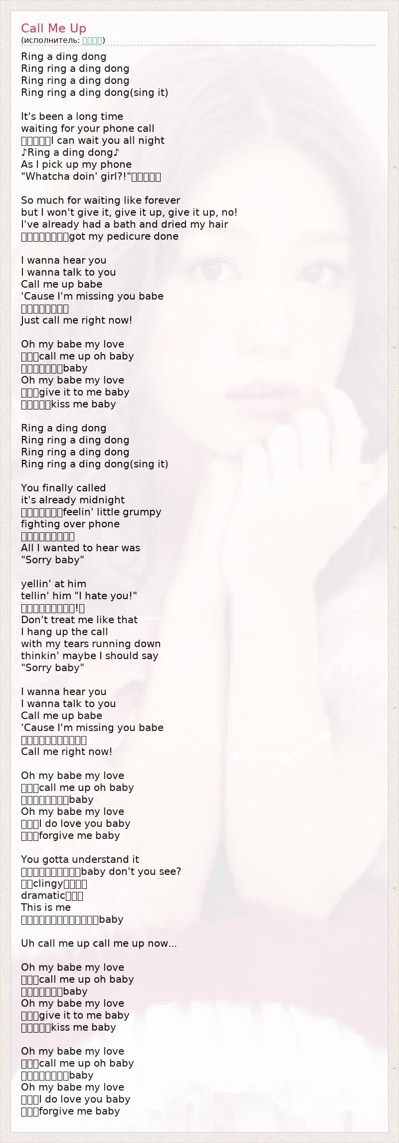 Ring a ding dong Ring ring a ding dong Ring ring a ding dong Ring ring a ding dong(sing it) It's been a long time waiting for your phone call 一晩中でもI can wait you all night ♪Ring a ding dong♪ As I pick up my phone "Whatcha doin' girl?!"友達だった So much for waiting like forever but I won't give it, give it up, give it up, no! I've already had a bath and dried my hair ヒマすぎちゃってgot my pedicure done I wanna hear you I wanna talk to you Call me up babe 'Cause I'm missing you babe 待ちきれないから Just call me right now! Oh my babe my love 今すぐcall me up oh baby オヤスミの前にbaby Oh my babe my love 今すぐgive it to me baby 電話越しにkiss me baby Ring a ding dong Ring ring a ding dong Ring ring a ding dong Ring ring a ding dong(sing it) You finally called it's already midnight 待ちくたびれてfeelin' little grumpy fighting over phone ちょっと意地張って All I wanted to hear was "Sorry baby" yellin' at him tellin' him "I hate you!" 「マジ信じらんない!」 Don't treat me like that I hang up the call with my tears running down thinkin' maybe I should say "Sorry baby" I wanna hear you I wanna talk to you Call me up babe 'Cause I'm missing you babe こっちからかけたくない Call me right now! Oh my babe my love 今すぐcall me up oh baby 素直になれないのbaby Oh my babe my love 本当はI do love you baby お願いforgive me baby You gotta understand it 本当はすごく寂しいのbaby don't you see? 少しclingyだけれど dramaticだけど This is me ありのまま受け止めて欲しいbaby Uh call me up call me up now... Oh my babe my love 今すぐcall me up oh baby オヤスミの前にbaby Oh my babe my love 今すぐgive it to me baby 電話越しにkiss me baby Oh my babe my love 今すぐcall me up oh baby 素直になれないのbaby Oh my babe my love 本当はI do love you baby お願いforgive me baby