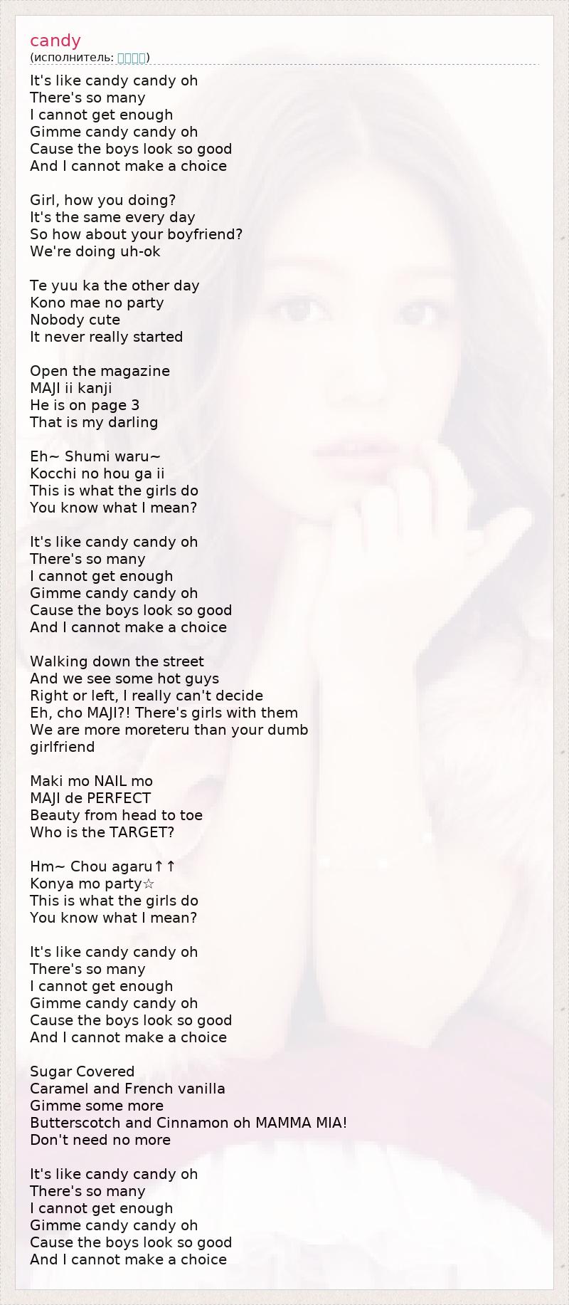 It's like candy candy oh There's so many I cannot get enough Gimme candy candy oh Cause the boys look so good And I cannot make a choice Girl, how you doing? It's the same every day So how about your boyfriend? We're doing uh-ok Te yuu ka the other day Kono mae no party Nobody cute It never really started Open the magazine MAJI ii kanji He is on page 3 That is my darling Eh~ Shumi waru~ Kocchi no hou ga ii This is what the girls do You know what I mean? It's like candy candy oh There's so many I cannot get enough Gimme candy candy oh Cause the boys look so good And I cannot make a choice Walking down the street And we see some hot guys Right or left, I really can't decide Eh, cho MAJI?! There's girls with them We are more moreteru than your dumb girlfriend Maki mo NAIL mo MAJI de PERFECT Beauty from head to toe Who is the TARGET? Hm~ Chou agaru↑↑ Konya mo party☆ This is what the girls do You know what I mean? It's like candy candy oh There's so many I cannot get enough Gimme candy candy oh Cause the boys look so good And I cannot make a choice Sugar Covered Caramel and French vanilla Gimme some more Butterscotch and Cinnamon oh MAMMA MIA! Don't need no more It's like candy candy oh There's so many I cannot get enough Gimme candy candy oh Cause the boys look so good And I cannot make a choice
