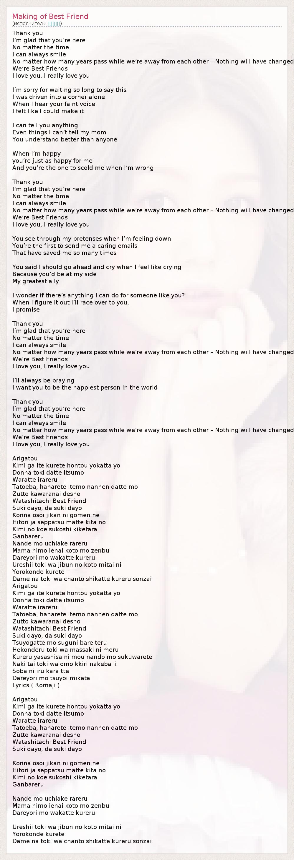 Спасибо Я рад, что вы здесь Независимо от того, время Я всегда могу улыбаться Независимо от того, сколько лет пройдет , пока мы далеко друг от друга - Ничего не изменится Мы лучшие друзья Я люблю тебя , я действительно люблю тебя Я прошу прощения за ждать так долго , чтобы сказать, что это Я был загнан в угол в одиночку Когда я слышу свой слабый голос Я чувствовал, что я мог сделать это Я могу вам сказать Даже вещи, которые я не могу сказать моей маме Вы лучше других понимают, Когда я счастлив вы просто счастливы, для меня И ты один ругать меня, когда я ошибаюсь Спасибо Я рад, что вы здесь Независимо от того, время Я всегда могу улыбаться Независимо от того, сколько лет пройдет , пока мы далеко друг от друга - Ничего не изменится Мы лучшие друзья Я люблю тебя , я действительно люблю тебя Вы видите в моих предлогами , когда мне плохо Ты первый выслать заботливого письма Это спасли мне так много раз Вы сказали, что я должен идти вперед и плакать, когда мне хочется плакать Потому что вы были бы на моей стороне Мой большой союзник Интересно, если есть все, что я могу сделать для такого, как ты ? Когда я с этим разберусь я мчаться к вам , Я обещаю Спасибо Я рад, что вы здесь Независимо от того, время Я всегда могу улыбаться Независимо от того, сколько лет пройдет , пока мы далеко друг от друга - Ничего не изменится Мы лучшие друзья Я люблю тебя , я действительно люблю тебя Я всегда буду молиться Я хочу, чтобы ты самый счастливый человек в мире Спасибо Я рад, что вы здесь Независимо от того, время Я всегда могу улыбаться Независимо от того, сколько лет пройдет , пока мы далеко друг от друга - Ничего не изменится Мы лучшие друзья Я люблю тебя , я действительно люблю тебя Arigatou Кими га ITE kurete Hontou yokatta лет Донна токи Datte Itsumo Waratte irareru Tatoeba , hanarete itemo Наннен Datte мо Zutto Kawaranai Desho Watashitachi Best Friend Суки Dayo , Daisuki Dayo Konna osoi Jikan Ni Gomen пе Hitori JA seppatsu матовый кита нет Не Кими не кнэ sukoshi kiketara Ganbareru Nande мо uchiake rareru Мама NiMo ienai кото пн Zenbu Dareyori мо wakatte kureru Ureshii токи ва не Jibun не кото Mitai Ni Yorokonde kurete Дам па токи ва Chanto shikatte kureru sonzai Arigatou Кими га ITE kurete Hontou yokatta лет Донна токи Datte Itsumo Waratte irareru Tatoeba , hanarete itemo Наннен Datte мо Zutto Kawaranai Desho Watashitachi Best Friend Суки Dayo , Daisuki Dayo Tsuyogatte мо suguni голый Теру Hekonderu токи ва Массаки Ni Меру Kureru yasashisa Ni му Nando мо sukuwarete Наки тай токи ва omoikkiri nakeba II Soba Ni МСАТ Кара TTE Dareyori мо tsuyoi Миката Песни ( Romaji ) Arigatou Кими га ITE kurete Hontou yokatta лет Донна токи Datte Itsumo Waratte irareru Tatoeba , hanarete itemo Наннен Datte мо Zutto Kawaranai Desho Watashitachi Best Friend Суки Dayo , Daisuki Dayo Konna osoi Jikan Ni Gomen пе Hitori JA seppatsu матовый кита нет Не Кими не кнэ sukoshi kiketara Ganbareru Nande мо uchiake rareru Мама NiMo ienai кото пн Zenbu Dareyori мо wakatte kureru Ureshii токи ва не Jibun не кото Mitai Ni Yorokonde kurete Дам па токи ва Chanto shikatte kureru sonzai