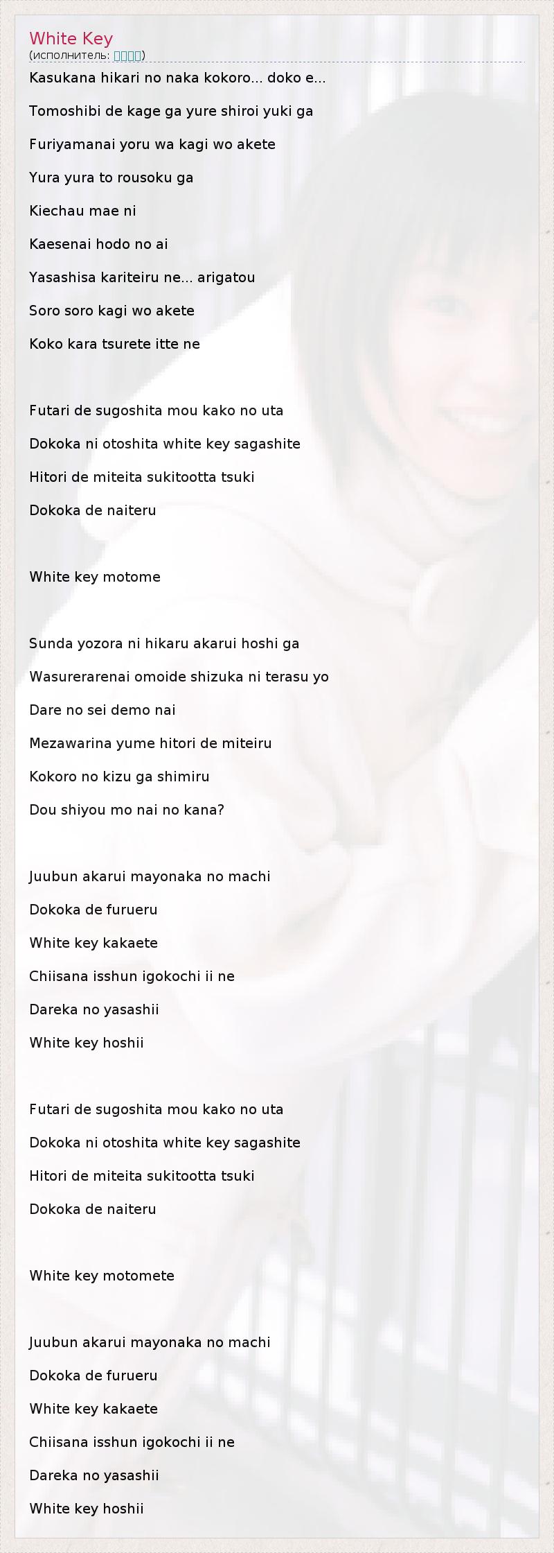 Kasukana hikari no naka kokoro... doko e... Tomoshibi de kage ga yure shiroi yuki ga Furiyamanai yoru wa kagi wo akete Yura yura to rousoku ga Kiechau mae ni Kaesenai hodo no ai Yasashisa kariteiru ne... arigatou Soro soro kagi wo akete Koko kara tsurete itte ne Futari de sugoshita mou kako no uta Dokoka ni otoshita white key sagashite Hitori de miteita sukitootta tsuki Dokoka de naiteru White key motome Sunda yozora ni hikaru akarui hoshi ga Wasurerarenai omoide shizuka ni terasu yo Dare no sei demo nai Mezawarina yume hitori de miteiru Kokoro no kizu ga shimiru Dou shiyou mo nai no kana? Juubun akarui mayonaka no machi Dokoka de furueru White key kakaete Chiisana isshun igokochi ii ne Dareka no yasashii White key hoshii Futari de sugoshita mou kako no uta Dokoka ni otoshita white key sagashite Hitori de miteita sukitootta tsuki Dokoka de naiteru White key motomete Juubun akarui mayonaka no machi Dokoka de furueru White key kakaete Chiisana isshun igokochi ii ne Dareka no yasashii White key hoshii