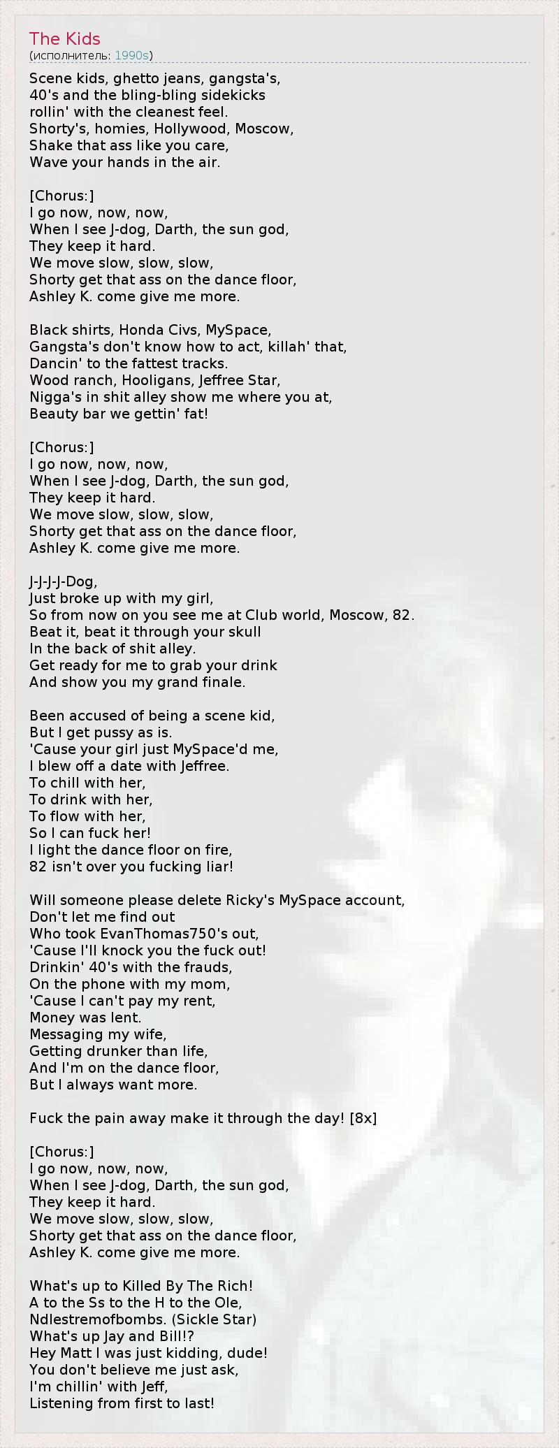 Scene kids, ghetto jeans, gangsta's, 40's and the bling-bling sidekicks rollin' with the cleanest feel. Shorty's, homies, Hollywood, Moscow, Shake that ass like you care, Wave your hands in the air. [Chorus:] I go now, now, now, When I see J-dog, Darth, the sun god, They keep it hard. We move slow, slow, slow, Shorty get that ass on the dance floor, Ashley K. come give me more. Black shirts, Honda Civs, MySpace, Gangsta's don't know how to act, killah' that, Dancin' to the fattest tracks. Wood ranch, Hooligans, Jeffree Star, Nigga's in shit alley show me where you at, Beauty bar we gettin' fat! [Chorus:] I go now, now, now, When I see J-dog, Darth, the sun god, They keep it hard. We move slow, slow, slow, Shorty get that ass on the dance floor, Ashley K. come give me more. J-J-J-J-Dog, Just broke up with my girl, So from now on you see me at Club world, Moscow, 82. Beat it, beat it through your skull In the back of shit alley. Get ready for me to grab your drink And show you my grand finale. Been accused of being a scene kid, But I get pussy as is. 'Cause your girl just MySpace'd me, I blew off a date with Jeffree. To chill with her, To drink with her, To flow with her, So I can fuck her! I light the dance floor on fire, 82 isn't over you fucking liar! Will someone please delete Ricky's MySpace account, Don't let me find out Who took EvanThomas750's out, 'Cause I'll knock you the fuck out! Drinkin' 40's with the frauds, On the phone with my mom, 'Cause I can't pay my rent, Money was lent. Messaging my wife, Getting drunker than life, And I'm on the dance floor, But I always want more. Fuck the pain away make it through the day! [8x] [Chorus:] I go now, now, now, When I see J-dog, Darth, the sun god, They keep it hard. We move slow, slow, slow, Shorty get that ass on the dance floor, Ashley K. come give me more. What's up to Killed By The Rich! A to the Ss to the H to the Ole, Ndlestremofbombs. (Sickle Star) What's up Jay and Bill!? Hey Matt I was just kidding, dude! You don't believe me just ask, I'm chillin' with Jeff, Listening from first to last!