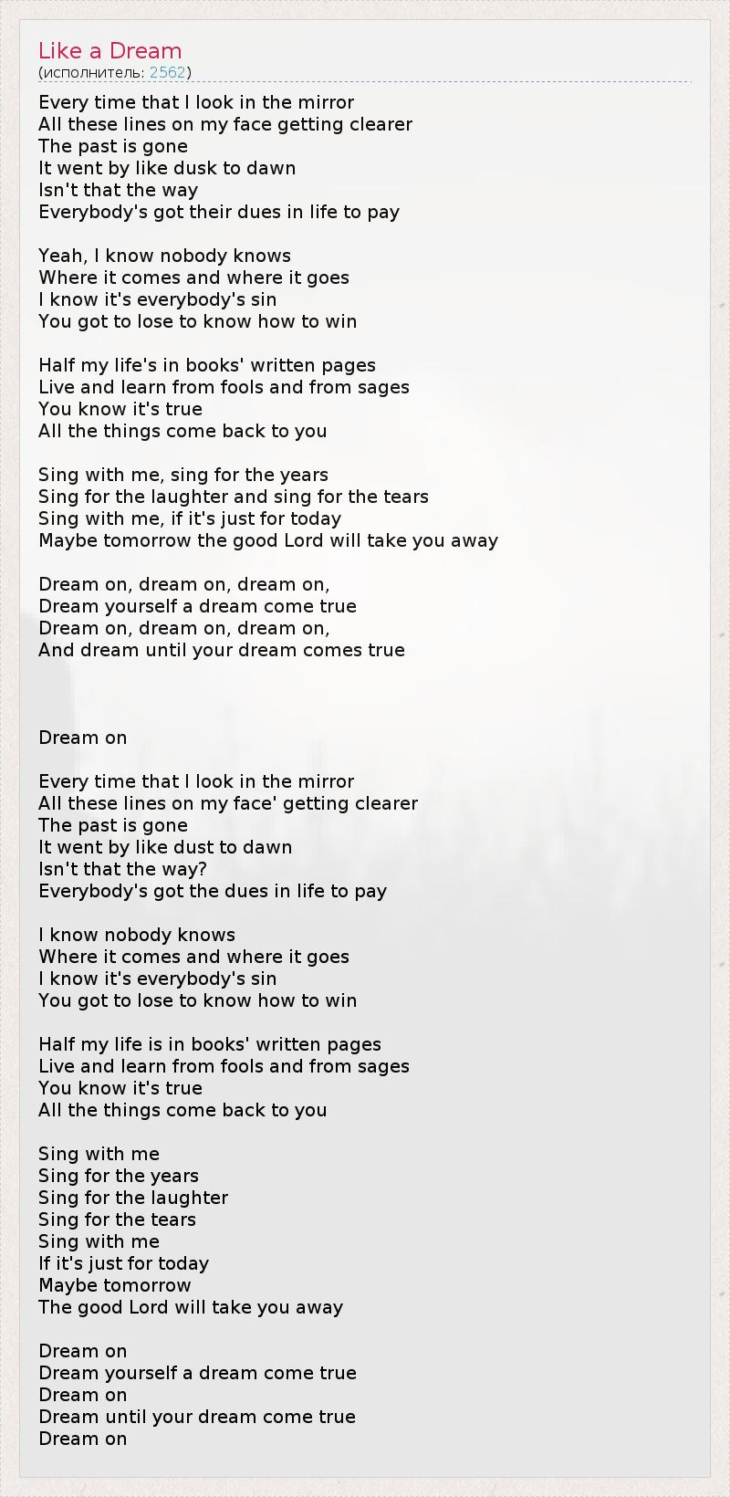 Every time that I look in the mirror All these lines on my face getting clearer The past is gone It went by like dusk to dawn Isn't that the way Everybody's got their dues in life to pay Yeah, I know nobody knows Where it comes and where it goes I know it's everybody's sin You got to lose to know how to win Half my life's in books' written pages Live and learn from fools and from sages You know it's true All the things come back to you Sing with me, sing for the years Sing for the laughter and sing for the tears Sing with me, if it's just for today Maybe tomorrow the good Lord will take you away Dream on, dream on, dream on, Dream yourself a dream come true Dream on, dream on, dream on, And dream until your dream comes true Dream on Every time that I look in the mirror All these lines on my face' getting clearer The past is gone It went by like dust to dawn Isn't that the way? Everybody's got the dues in life to pay I know nobody knows Where it comes and where it goes I know it's everybody's sin You got to lose to know how to win Half my life is in books' written pages Live and learn from fools and from sages You know it's true All the things come back to you Sing with me Sing for the years Sing for the laughter Sing for the tears Sing with me If it's just for today Maybe tomorrow The good Lord will take you away Dream on Dream yourself a dream come true Dream on Dream until your dream come true Dream on