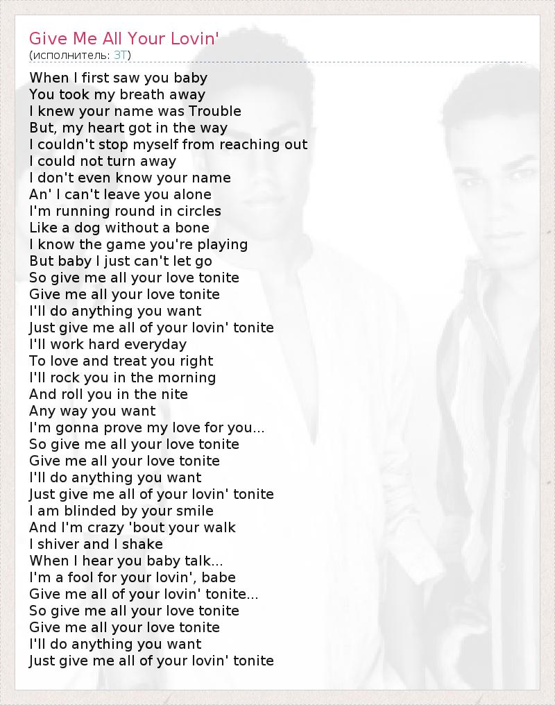 When I first saw you baby You took my breath away I knew your name was Trouble But, my heart got in the way I couldn't stop myself from reaching out I could not turn away I don't even know your name An' I can't leave you alone I'm running round in circles Like a dog without a bone I know the game you're playing But baby I just can't let go So give me all your love tonite Give me all your love tonite I'll do anything you want Just give me all of your lovin' tonite I'll work hard everyday To love and treat you right I'll rock you in the morning And roll you in the nite Any way you want I'm gonna prove my love for you... So give me all your love tonite Give me all your love tonite I'll do anything you want Just give me all of your lovin' tonite I am blinded by your smile And I'm crazy 'bout your walk I shiver and I shake When I hear you baby talk... I'm a fool for your lovin', babe Give me all of your lovin' tonite... So give me all your love tonite Give me all your love tonite I'll do anything you want Just give me all of your lovin' tonite