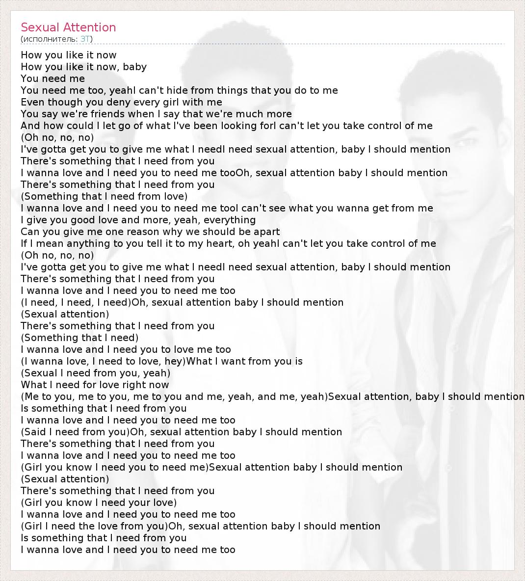 How you like it now How you like it now, baby You need me You need me too, yeahI can't hide from things that you do to me Even though you deny every girl with me You say we're friends when I say that we're much more And how could I let go of what I've been looking forI can't let you take control of me (Oh no, no, no) I've gotta get you to give me what I needI need sexual attention, baby I should mention There's something that I need from you I wanna love and I need you to need me tooOh, sexual attention baby I should mention There's something that I need from you (Something that I need from love) I wanna love and I need you to need me tooI can't see what you wanna get from me I give you good love and more, yeah, everything Can you give me one reason why we should be apart If I mean anything to you tell it to my heart, oh yeahI can't let you take control of me (Oh no, no, no) I've gotta get you to give me what I needI need sexual attention, baby I should mention There's something that I need from you I wanna love and I need you to need me too (I need, I need, I need)Oh, sexual attention baby I should mention (Sexual attention) There's something that I need from you (Something that I need) I wanna love and I need you to love me too (I wanna love, I need to love, hey)What I want from you is (Sexual I need from you, yeah) What I need for love right now (Me to you, me to you, me to you and me, yeah, and me, yeah)Sexual attention, baby I should mention Is something that I need from you I wanna love and I need you to need me too (Said I need from you)Oh, sexual attention baby I should mention There's something that I need from you I wanna love and I need you to need me too (Girl you know I need you to need me)Sexual attention baby I should mention (Sexual attention) There's something that I need from you (Girl you know I need your love) I wanna love and I need you to need me too (Girl I need the love from you)Oh, sexual attention baby I should mention Is something that I need from you I wanna love and I need you to need me too