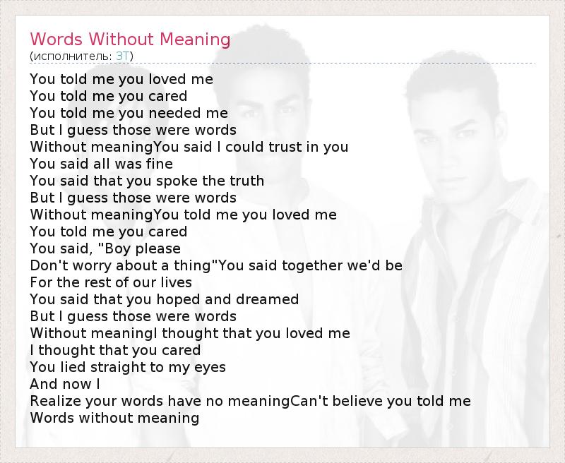 You told me you loved me You told me you cared You told me you needed me But I guess those were words Without meaningYou said I could trust in you You said all was fine You said that you spoke the truth But I guess those were words Without meaningYou told me you loved me You told me you cared You said, "Boy please Don't worry about a thing"You said together we'd be For the rest of our lives You said that you hoped and dreamed But I guess those were words Without meaningI thought that you loved me I thought that you cared You lied straight to my eyes And now I Realize your words have no meaningCan't believe you told me Words without meaning