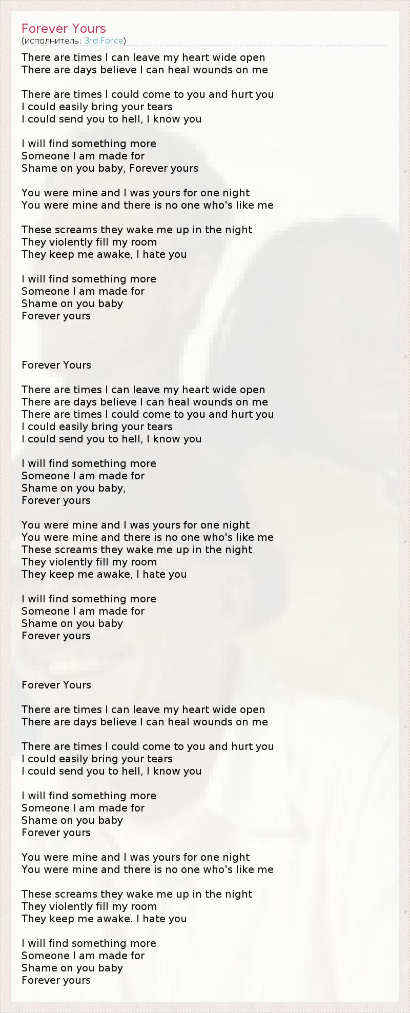 There are times I can leave my heart wide open There are days believe I can heal wounds on me There are times I could come to you and hurt you I could easily bring your tears I could send you to hell, I know you I will find something more Someone I am made for Shame on you baby, Forever yours You were mine and I was yours for one night You were mine and there is no one who's like me These screams they wake me up in the night They violently fill my room They keep me awake, I hate you I will find something more Someone I am made for Shame on you baby Forever yours Forever Yours There are times I can leave my heart wide open There are days believe I can heal wounds on me There are times I could come to you and hurt you I could easily bring your tears I could send you to hell, I know you I will find something more Someone I am made for Shame on you baby, Forever yours You were mine and I was yours for one night You were mine and there is no one who's like me These screams they wake me up in the night They violently fill my room They keep me awake, I hate you I will find something more Someone I am made for Shame on you baby Forever yours Forever Yours There are times I can leave my heart wide open There are days believe I can heal wounds on me There are times I could come to you and hurt you I could easily bring your tears I could send you to hell, I know you I will find something more Someone I am made for Shame on you baby Forever yours You were mine and I was yours for one night You were mine and there is no one who's like me These screams they wake me up in the night They violently fill my room They keep me awake. I hate you I will find something more Someone I am made for Shame on you baby Forever yours