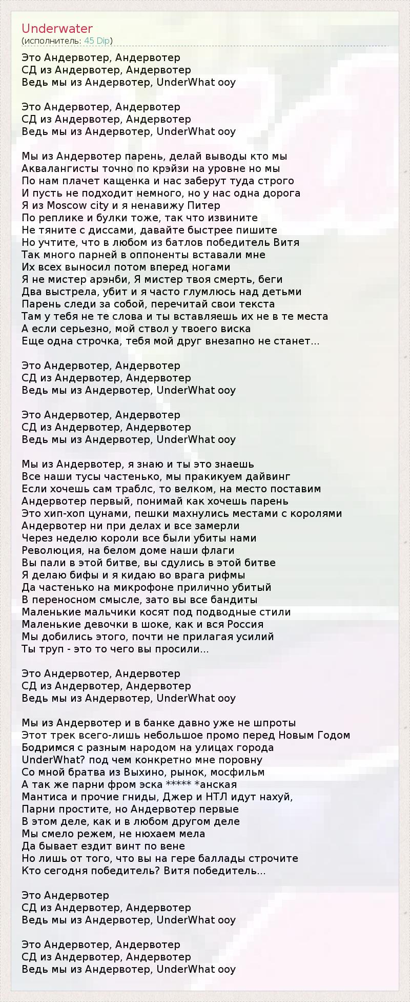 Это Андервотер, Андервотер СД из Андервотер, Андервотер Ведь мы из Андервотер, UnderWhat ooy Это Андервотер, Андервотер СД из Андервотер, Андервотер Ведь мы из Андервотер, UnderWhat ooy Мы из Андервотер парень, делай выводы кто мы Аквалангисты точно по крэйзи на уровне но мы По нам плачет кащенка и нас заберут туда строго И пусть не подходит немного, но у нас одна дорога Я из Moscow city и я ненавижу Питер По реплике и булки тоже, так что извините Не тяните с диссами, давайте быстрее пишите Но учтите, что в любом из батлов победитель Витя Так много парней в оппоненты вставали мне Их всех выносил потом вперед ногами Я не мистер арэнби, Я мистер твоя смерть, беги Два выстрела, убит и я часто глумлюсь над детьми Парень следи за собой, перечитай свои текста Там у тебя не те слова и ты вставляешь их не в те места А если серьезно, мой ствол у твоего виска Еще одна строчка, тебя мой друг внезапно не станет... Это Андервотер, Андервотер СД из Андервотер, Андервотер Ведь мы из Андервотер, UnderWhat ooy Это Андервотер, Андервотер СД из Андервотер, Андервотер Ведь мы из Андервотер, UnderWhat ooy Мы из Андервотер, я знаю и ты это знаешь Все наши тусы частенько, мы пракикуем дайвинг Если хочешь сам траблс, то велком, на место поставим Андервотер первый, понимай как хочешь парень Это хип-хоп цунами, пешки махнулись местами с королями Андервотер ни при делах и все замерли Через неделю короли все были убиты нами Революция, на белом доме наши флаги Вы пали в этой битве, вы сдулись в этой битве Я делаю бифы и я кидаю во врага рифмы Да частенько на микрофоне прилично убитый В переносном смысле, зато вы все бандиты Маленькие мальчики косят под подводные стили Маленькие девочки в шоке, как и вся Россия Мы добились этого, почти не прилагая усилий Ты труп - это то чего вы просили... Это Андервотер, Андервотер СД из Андервотер, Андервотер Ведь мы из Андервотер, UnderWhat ooy Мы из Андервотер и в банке давно уже не шпроты Этот трек всего-лишь небольшое промо перед Новым Годом Бодримся с разным народом на улицах города UnderWhat? под чем конкретно мне поровну Со мной братва из Выхино, рынок, мосфильм А так же парни фром эска ***** *анская Мантиса и прочие гниды, Джер и НТЛ идут наxyй, Парни простите, но Андервотер первые В этом деле, как и в любом другом деле Мы смело режем, не нюхаем мела Да бывает ездит винт по вене Но лишь от того, что вы на гере баллады строчите Кто сегодня победитель? Витя победитель... Это Андервотер СД из Андервотер, Андервотер Ведь мы из Андервотер, UnderWhat ooy Это Андервотер, Андервотер СД из Андервотер, Андервотер Ведь мы из Андервотер, UnderWhat ooy