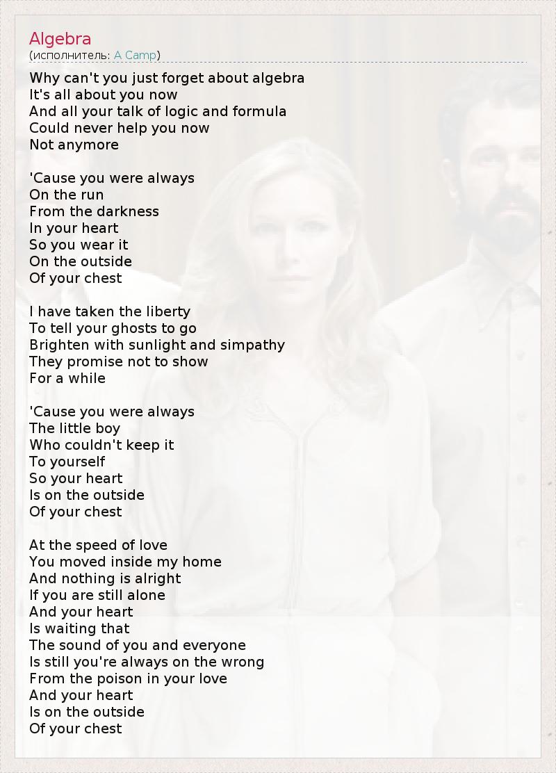 Why can't you just forget about algebra It's all about you now And all your talk of logic and formula Could never help you now Not anymore 'Cause you were always On the run From the darkness In your heart So you wear it On the outside Of your chest I have taken the liberty To tell your ghosts to go Brighten with sunlight and simpathy They promise not to show For a while 'Cause you were always The little boy Who couldn't keep it To yourself So your heart Is on the outside Of your chest At the speed of love You moved inside my home And nothing is alright If you are still alone And your heart Is waiting that The sound of you and everyone Is still you're always on the wrong From the poison in your love And your heart Is on the outside Of your chest