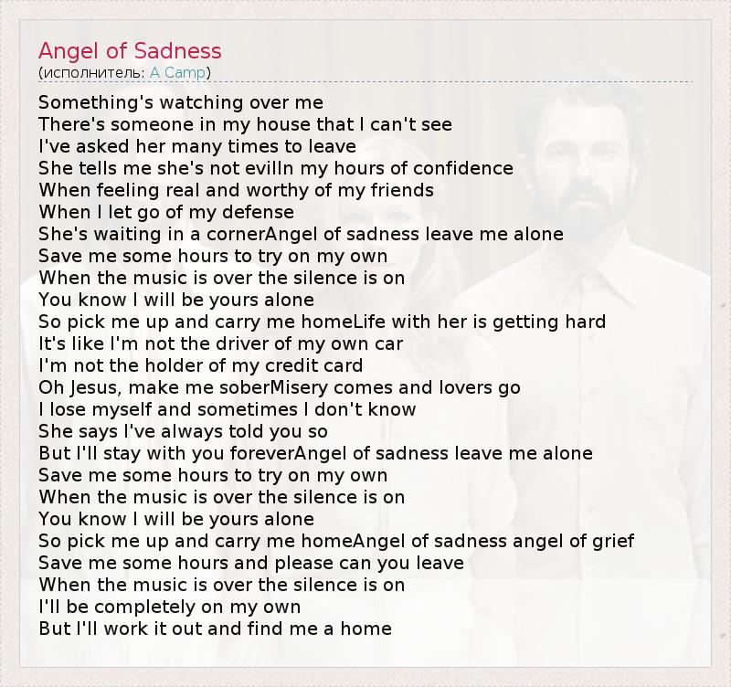 Something's watching over me There's someone in my house that I can't see I've asked her many times to leave She tells me she's not evilIn my hours of confidence When feeling real and worthy of my friends When I let go of my defense She's waiting in a cornerAngel of sadness leave me alone Save me some hours to try on my own When the music is over the silence is on You know I will be yours alone So pick me up and carry me homeLife with her is getting hard It's like I'm not the driver of my own car I'm not the holder of my credit card Oh Jesus, make me soberMisery comes and lovers go I lose myself and sometimes I don't know She says I've always told you so But I'll stay with you foreverAngel of sadness leave me alone Save me some hours to try on my own When the music is over the silence is on You know I will be yours alone So pick me up and carry me homeAngel of sadness angel of grief Save me some hours and please can you leave When the music is over the silence is on I'll be completely on my own But I'll work it out and find me a home