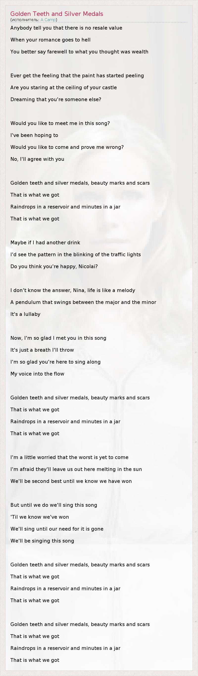Anybody tell you that there is no resale value When your romance goes to hell You better say farewell to what you thought was wealth Ever get the feeling that the paint has started peeling Are you staring at the ceiling of your castle Dreaming that you're someone else? Would you like to meet me in this song? I've been hoping to Would you like to come and prove me wrong? No, I'll agree with you Golden teeth and silver medals, beauty marks and scars That is what we got Raindrops in a reservoir and minutes in a jar That is what we got Maybe if I had another drink I'd see the pattern in the blinking of the traffic lights Do you think you're happy, Nicolai? I don't know the answer, Nina, life is like a melody A pendulum that swings between the major and the minor It's a lullaby Now, I'm so glad I met you in this song It's just a breath I'll throw I'm so glad you're here to sing along My voice into the flow Golden teeth and silver medals, beauty marks and scars That is what we got Raindrops in a reservoir and minutes in a jar That is what we got I'm a little worried that the worst is yet to come I'm afraid they'll leave us out here melting in the sun We'll be second best until we know we have won But until we do we'll sing this song 'Til we know we've won We'll sing until our need for it is gone We'll be singing this song Golden teeth and silver medals, beauty marks and scars That is what we got Raindrops in a reservoir and minutes in a jar That is what we got Golden teeth and silver medals, beauty marks and scars That is what we got Raindrops in a reservoir and minutes in a jar That is what we got