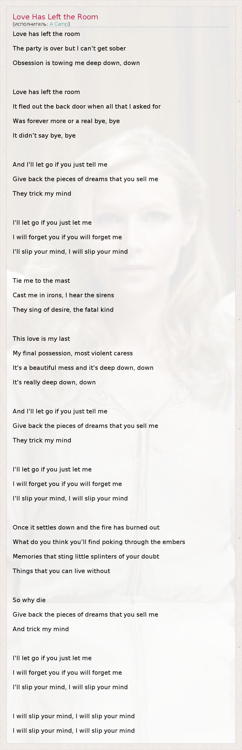 Love has left the room The party is over but I can't get sober Obsession is towing me deep down, down Love has left the room It fled out the back door when all that I asked for Was forever more or a real bye, bye It didn't say bye, bye And I'll let go if you just tell me Give back the pieces of dreams that you sell me They trick my mind I'll let go if you just let me I will forget you if you will forget me I'll slip your mind, I will slip your mind Tie me to the mast Cast me in irons, I hear the sirens They sing of desire, the fatal kind This love is my last My final possession, most violent caress It's a beautiful mess and it's deep down, down It's really deep down, down And I'll let go if you just tell me Give back the pieces of dreams that you sell me They trick my mind I'll let go if you just let me I will forget you if you will forget me I'll slip your mind, I will slip your mind Once it settles down and the fire has burned out What do you think you'll find poking through the embers Memories that sting little splinters of your doubt Things that you can live without So why die Give back the pieces of dreams that you sell me And trick my mind I'll let go if you just let me I will forget you if you will forget me I'll slip your mind, I will slip your mind I will slip your mind, I will slip your mind I will slip your mind, I will slip your mind