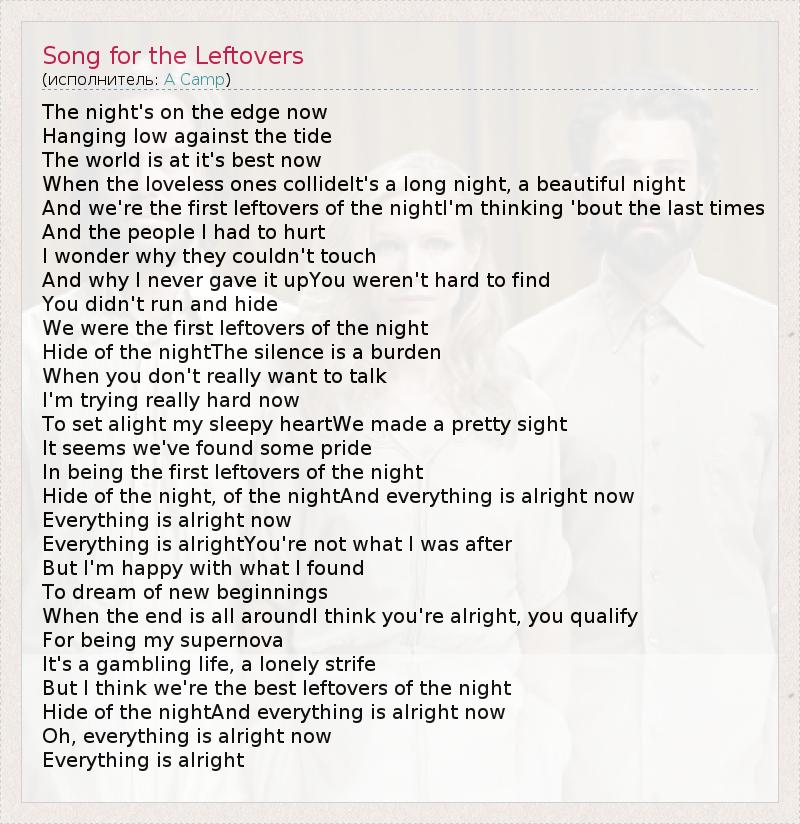 The night's on the edge now Hanging low against the tide The world is at it's best now When the loveless ones collideIt's a long night, a beautiful night And we're the first leftovers of the nightI'm thinking 'bout the last times And the people I had to hurt I wonder why they couldn't touch And why I never gave it upYou weren't hard to find You didn't run and hide We were the first leftovers of the night Hide of the nightThe silence is a burden When you don't really want to talk I'm trying really hard now To set alight my sleepy heartWe made a pretty sight It seems we've found some pride In being the first leftovers of the night Hide of the night, of the nightAnd everything is alright now Everything is alright now Everything is alrightYou're not what I was after But I'm happy with what I found To dream of new beginnings When the end is all aroundI think you're alright, you qualify For being my supernova It's a gambling life, a lonely strife But I think we're the best leftovers of the night Hide of the nightAnd everything is alright now Oh, everything is alright now Everything is alright