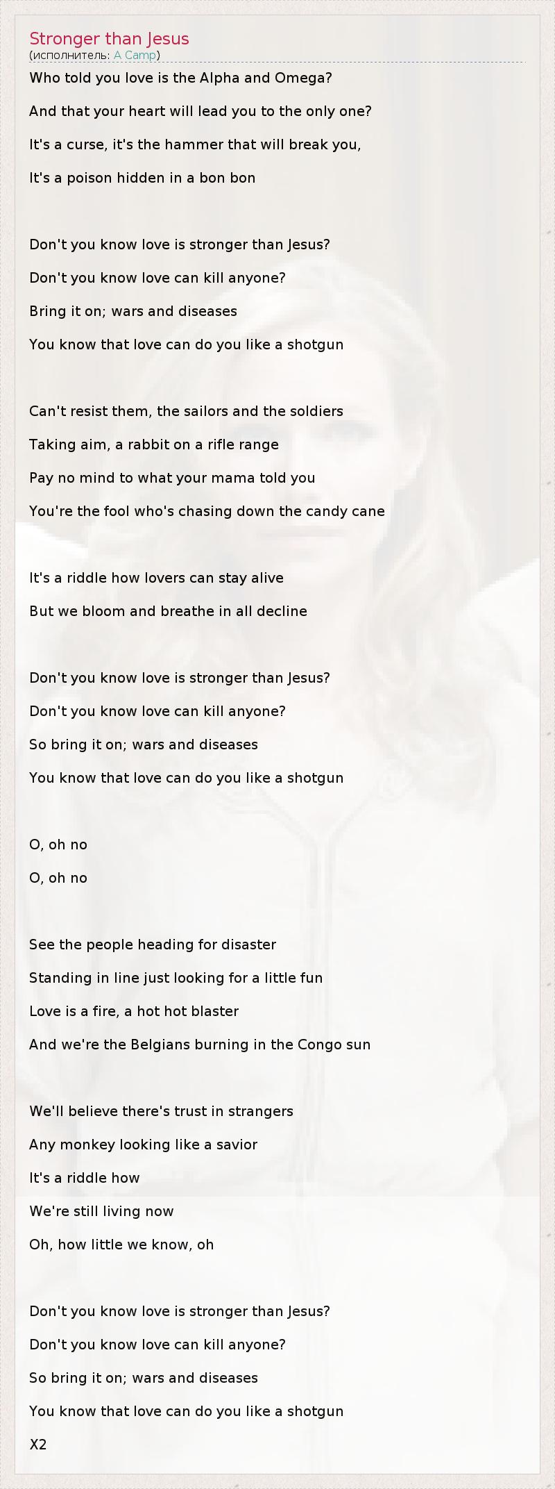 Who told you love is the Alpha and Omega? And that your heart will lead you to the only one? It's a curse, it's the hammer that will break you, It's a poison hidden in a bon bon Don't you know love is stronger than Jesus? Don't you know love can kill anyone? Bring it on; wars and diseases You know that love can do you like a shotgun Can't resist them, the sailors and the soldiers Taking aim, a rabbit on a rifle range Pay no mind to what your mama told you You're the fool who's chasing down the candy cane It's a riddle how lovers can stay alive But we bloom and breathe in all decline Don't you know love is stronger than Jesus? Don't you know love can kill anyone? So bring it on; wars and diseases You know that love can do you like a shotgun O, oh no O, oh no See the people heading for disaster Standing in line just looking for a little fun Love is a fire, a hot hot blaster And we're the Belgians burning in the Congo sun We'll believe there's trust in strangers Any monkey looking like a savior It's a riddle how We're still living now Oh, how little we know, oh Don't you know love is stronger than Jesus? Don't you know love can kill anyone? So bring it on; wars and diseases You know that love can do you like a shotgun X2