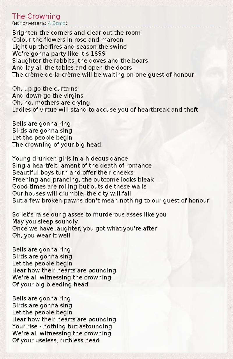 Украсьте углы и очистить комнату Раскрась цветы в розовых и темно-бордовый Зажгите огонь и сезонсвиной Мы собираемся партии, как это 1699 Убоя кроликов , голубей и кабанов И лежал все таблицы и открыть двери Крем - де - ла - крем будет ждать на одном почетного гостя О, до идти шторы И вниз идти девственниц О, нет, матери плачут Дамы добродетели будет стоять обвинить вас в горе и кражи Колокола собираются кольцо Птицы собираются петь Пусть люди начинают Венцом вашего большой головой Молодые пьяные девушки в отвратительной танца Спойте сердечную плач о смерти романтики Красивые мальчики повернуть и предлагают свои щеки Preening и скачущий , результат выглядит мрачным Хорошие времена катятся , но вне этих стен Наши дома будут рушиться , город упадет Но несколько сломанных пешки не не значат для нашего почетного гостя Так что давайте поднимем бокалы убийственных ослов , как вы Желаю вам спать спокойно Как только у нас смех , вы получили то, что вы после О, вы носите его хорошо Колокола собираются кольцо Птицы собираются петь Пусть люди начинают Послушайте, как их сердца стучать Мы все являемся свидетелями коронации Из вашей большой окровавленной головой Колокола собираются кольцо Птицы собираются петь Пусть люди начинают Послушайте, как их сердца стучать Ваш рост - ничего, кроме поразительным Мы все являемся свидетелями коронации Из вашего бесполезной , безжалостной голове