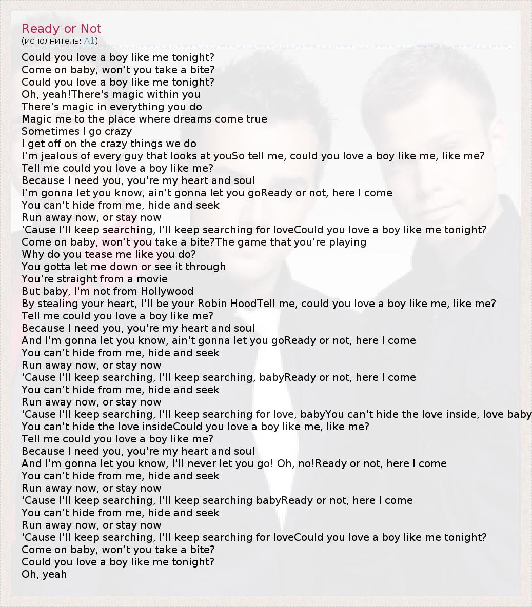 Could you love a boy like me tonight? Come on baby, won't you take a bite? Could you love a boy like me tonight? Oh, yeah!There's magic within you There's magic in everything you do Magic me to the place where dreams come true Sometimes I go crazy I get off on the crazy things we do I'm jealous of every guy that looks at youSo tell me, could you love a boy like me, like me? Tell me could you love a boy like me? Because I need you, you're my heart and soul I'm gonna let you know, ain't gonna let you goReady or not, here I come You can't hide from me, hide and seek Run away now, or stay now 'Cause I'll keep searching, I'll keep searching for loveCould you love a boy like me tonight? Come on baby, won't you take a bite?The game that you're playing Why do you tease me like you do? You gotta let me down or see it through You're straight from a movie But baby, I'm not from Hollywood By stealing your heart, I'll be your Robin HoodTell me, could you love a boy like me, like me? Tell me could you love a boy like me? Because I need you, you're my heart and soul And I'm gonna let you know, ain't gonna let you goReady or not, here I come You can't hide from me, hide and seek Run away now, or stay now 'Cause I'll keep searching, I'll keep searching, babyReady or not, here I come You can't hide from me, hide and seek Run away now, or stay now 'Cause I'll keep searching, I'll keep searching for love, babyYou can't hide the love inside, love baby You can't hide the love insideCould you love a boy like me, like me? Tell me could you love a boy like me? Because I need you, you're my heart and soul And I'm gonna let you know, I'll never let you go! Oh, no!Ready or not, here I come You can't hide from me, hide and seek Run away now, or stay now 'Cause I'll keep searching, I'll keep searching babyReady or not, here I come You can't hide from me, hide and seek Run away now, or stay now 'Cause I'll keep searching, I'll keep searching for loveCould you love a boy like me tonight? Come on baby, won't you take a bite? Could you love a boy like me tonight? Oh, yeah