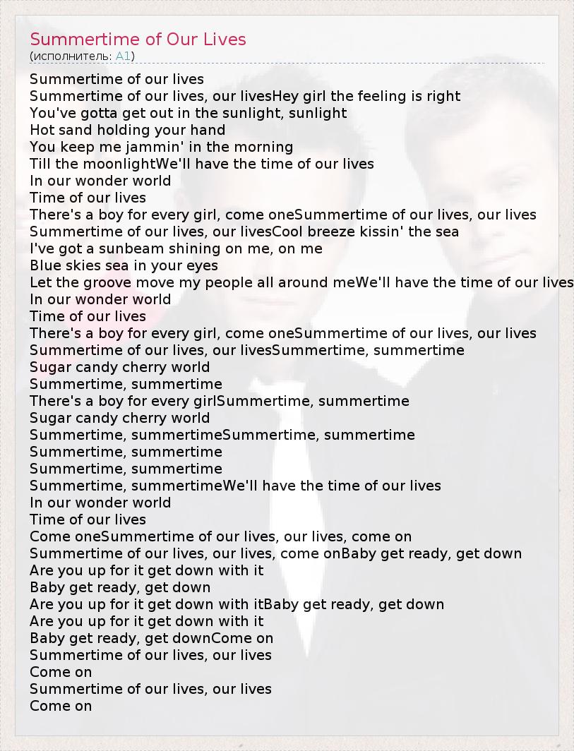 Summertime of our lives Summertime of our lives, our livesHey girl the feeling is right You've gotta get out in the sunlight, sunlight Hot sand holding your hand You keep me jammin' in the morning Till the moonlightWe'll have the time of our lives In our wonder world Time of our lives There's a boy for every girl, come oneSummertime of our lives, our lives Summertime of our lives, our livesCool breeze kissin' the sea I've got a sunbeam shining on me, on me Blue skies sea in your eyes Let the groove move my people all around meWe'll have the time of our lives In our wonder world Time of our lives There's a boy for every girl, come oneSummertime of our lives, our lives Summertime of our lives, our livesSummertime, summertime Sugar candy cherry world Summertime, summertime There's a boy for every girlSummertime, summertime Sugar candy cherry world Summertime, summertimeSummertime, summertime Summertime, summertime Summertime, summertime Summertime, summertimeWe'll have the time of our lives In our wonder world Time of our lives Come oneSummertime of our lives, our lives, come on Summertime of our lives, our lives, come onBaby get ready, get down Are you up for it get down with it Baby get ready, get down Are you up for it get down with itBaby get ready, get down Are you up for it get down with it Baby get ready, get downCome on Summertime of our lives, our lives Come on Summertime of our lives, our lives Come on