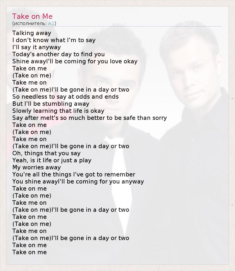Talking away I don't know what I'm to say I'll say it anyway Today's another day to find you Shine awayI'll be coming for you love okay Take on me (Take on me) Take me on (Take on me)I'll be gone in a day or two So needless to say at odds and ends But I'll be stumbling away Slowly learning that life is okay Say after meIt's so much better to be safe than sorry Take on me (Take on me) Take me on (Take on me)I'll be gone in a day or two Oh, things that you say Yeah, is it life or just a play My worries away You're all the things I've got to remember You shine awayI'll be coming for you anyway Take on me (Take on me) Take me on (Take on me)I'll be gone in a day or two Take on me (Take on me) Take me on (Take on me)I'll be gone in a day or two Take on me Take on me