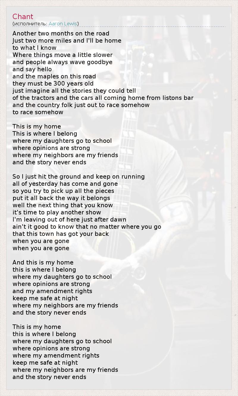 Еще два месяца в пути, Еще лишь две мили - и я буду дома, Там, где мне все знакомо, Там, где все происходит немного медленнее, Люди там всегда машут рукой на прощание И приветствуют друг друга, И клёнам вдоль дороги, Должно быть, триста лет. Просто представьте себе все истории, которые они смогли бы поведать о Тракторах и машинах, что возвращались домой из бара Листон 1, И народе, что выходит просто погонять, Просто погонять Это мой дом, Здесь я свой, Здесь мои дочери ходят в школу, Здесь убеждения глубоки, Здесь все мои соседи - друзья, И история никогда не кончается Я упал на землю, и продолжаю бежать, Прошлое пришло и ушло... Ты пытаешься собрать осколки, Собрать их так, как нужно, И что еще ты знаешь, так это то, что Время сыграть еще одно представление. Я покину этот край с восходом солнца, Не правда ли прекрасно осознавать, что куда бы ты ни шел, Ты всегда сможешь вернуться в этот город, Когда ты уйдешь, Когда ты уйдешь Это мой дом, Здесь я свой, Здесь мои дочери ходят в школу, А мнения играют роль, И меня всегда поймут, дополнят, Место, где я чувствую себя в безопасности. Где все мои соседи - друзья, И история никогда не кончается Это мой дом, Здесь я свой, Здесь мои дочери ходят в школу, А мнения играют роль, И меня всегда поймут, дополнят, Место, где я чувствую себя в безопасности. Где все мои соседи - друзья, И история никогда не кончается 1 - известный бар из города Вортингтон, штат Массачусетс. Вортингтон - Родина Аарона Льюиса