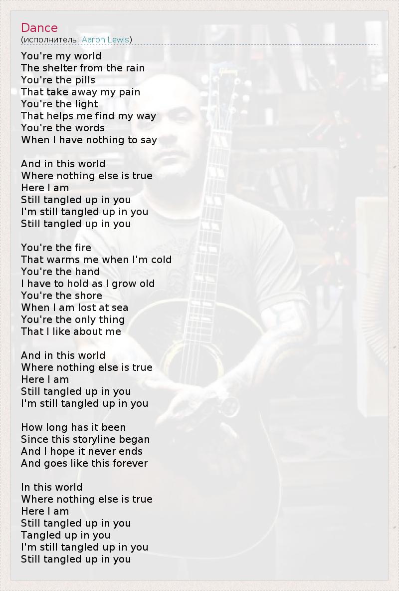 You're my world The shelter from the rain You're the pills That take away my pain You're the light That helps me find my way You're the words When I have nothing to say And in this world Where nothing else is true Here I am Still tangled up in you I'm still tangled up in you Still tangled up in you You're the fire That warms me when I'm cold You're the hand I have to hold as I grow old You're the shore When I am lost at sea You're the only thing That I like about me And in this world Where nothing else is true Here I am Still tangled up in you I'm still tangled up in you How long has it been Since this storyline began And I hope it never ends And goes like this forever In this world Where nothing else is true Here I am Still tangled up in you Tangled up in you I'm still tangled up in you Still tangled up in you