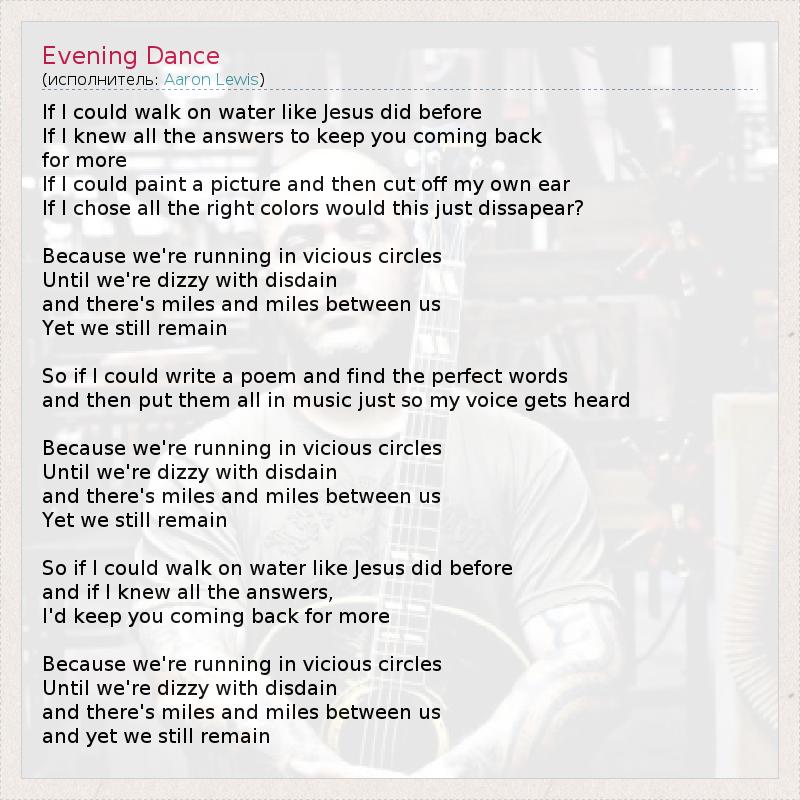 If I could walk on water like Jesus did before If I knew all the answers to keep you coming back for more If I could paint a picture and then cut off my own ear If I chose all the right colors would this just dissapear? Because we're running in vicious circles Until we're dizzy with disdain and there's miles and miles between us Yet we still remain So if I could write a poem and find the perfect words and then put them all in music just so my voice gets heard Because we're running in vicious circles Until we're dizzy with disdain and there's miles and miles between us Yet we still remain So if I could walk on water like Jesus did before and if I knew all the answers, I'd keep you coming back for more Because we're running in vicious circles Until we're dizzy with disdain and there's miles and miles between us and yet we still remain