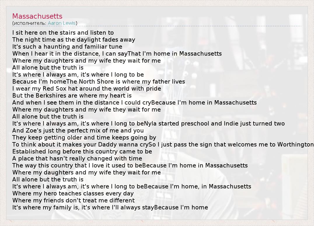 I sit here on the stairs and listen to The night time as the daylight fades away It's such a haunting and familiar tune When I hear it in the distance, I can sayThat I'm home in Massachusetts Where my daughters and my wife they wait for me All alone but the truth is It's where I always am, it's where I long to be Because I'm homeThe North Shore is where my father lives I wear my Red Sox hat around the world with pride But the Berkshires are where my heart is And when I see them in the distance I could cryBecause I'm home in Massachusetts Where my daughters and my wife they wait for me All alone but the truth is It's where I always am, it's where I long to beNyla started preschool and Indie just turned two And Zoe's just the perfect mix of me and you They keep getting older and time keeps going by To think about it makes your Daddy wanna crySo I just pass the sign that welcomes me to Worthington Established long before this country came to be A place that hasn't really changed with time The way this country that I love it used to beBecause I'm home in Massachusetts Where my daughters and my wife they wait for me All alone but the truth is It's where I always am, it's where I long to beBecause I'm home, in Massachusetts Where my hero teaches classes every day Where my friends don't treat me different It's where my family is, it's where I'll always stayBecause I'm home