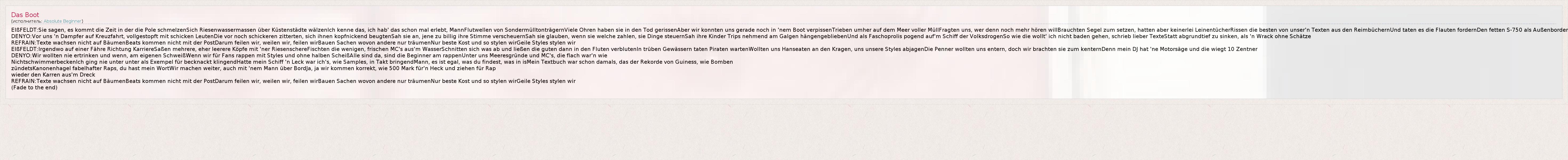 EIßFELDT:Sie sagen, es kommt die Zeit in der die Pole schmelzenSich Riesenwassermassen über Küstenstädte wälzenIch kenne das, ich hab' das schon mal erlebt, MannFlutwellen von SondermülltonträgernViele Ohren haben sie in den Tod gerissenAber wir konnten uns gerade noch in 'nem Boot verpissenTrieben umher auf dem Meer voller MüllFragten uns, wer denn noch mehr hören willBrauchten Segel zum setzen, hatten aber keinerlei LeinentücherRissen die besten von unser'n Texten aus den ReimbüchernUnd taten es die Flauten fordernDen fetten S-750 als Außenborder