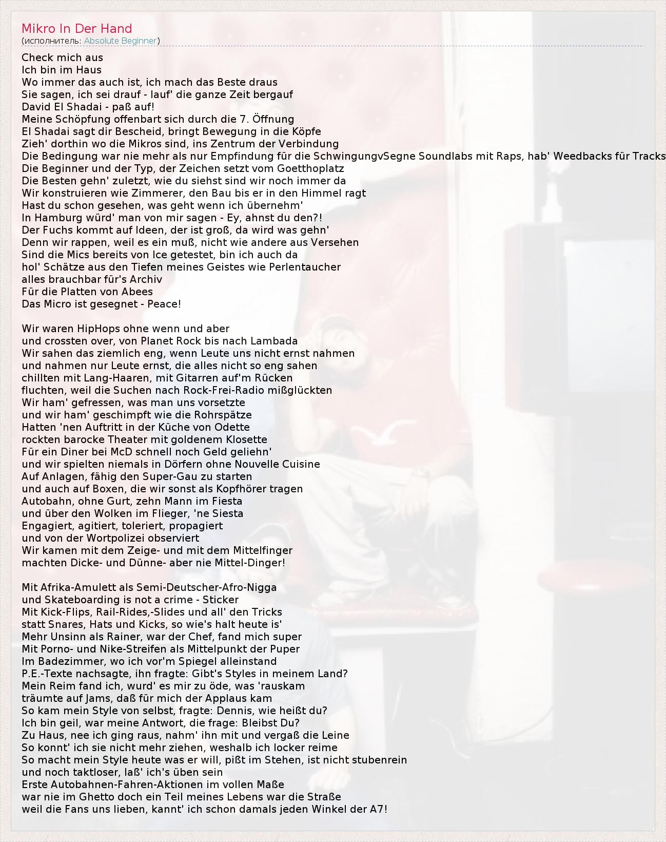 Check mich aus Ich bin im Haus Wo immer das auch ist, ich mach das Beste draus Sie sagen, ich sei drauf - lauf' die ganze Zeit bergauf David El Shadai - paß auf! Meine Schöpfung offenbart sich durch die 7. Öffnung El Shadai sagt dir Bescheid, bringt Bewegung in die Köpfe Zieh' dorthin wo die Mikros sind, ins Zentrum der Verbindung Die Bedingung war nie mehr als nur Empfindung für die SchwingungvSegne Soundlabs mit Raps, hab' Weedbacks für Tracks Die Beginner und der Typ, der Zeichen setzt vom Goetthoplatz Die Besten gehn' zuletzt, wie du siehst sind wir noch immer da Wir konstruieren wie Zimmerer, den Bau bis er in den Himmel ragt Hast du schon gesehen, was geht wenn ich übernehm' In Hamburg würd' man von mir sagen - Ey, ahnst du den?! Der Fuchs kommt auf Ideen, der ist groß, da wird was gehn' Denn wir rappen, weil es ein muß, nicht wie andere aus Versehen Sind die Mics bereits von Ice getestet, bin ich auch da hol' Schätze aus den Tiefen meines Geistes wie Perlentaucher alles brauchbar für's Archiv Für die Platten von Abees Das Micro ist gesegnet - Peace! Wir waren HipHops ohne wenn und aber und crossten over, von Planet Rock bis nach Lambada Wir sahen das ziemlich eng, wenn Leute uns nicht ernst nahmen und nahmen nur Leute ernst, die alles nicht so eng sahen chillten mit Lang-Haaren, mit Gitarren auf'm Rücken fluchten, weil die Suchen nach Rock-Frei-Radio mißglückten Wir ham' gefressen, was man uns vorsetzte und wir ham' geschimpft wie die Rohrspätze Hatten 'nen Auftritt in der Küche von Odette rockten barocke Theater mit goldenem Klosette Für ein Diner bei McD schnell noch Geld geliehn' und wir spielten niemals in Dörfern ohne Nouvelle Cuisine Auf Anlagen, fähig den Super-Gau zu starten und auch auf Boxen, die wir sonst als Kopfhörer tragen Autobahn, ohne Gurt, zehn Mann im Fiesta und über den Wolken im Flieger, 'ne Siesta Engagiert, agitiert, toleriert, propagiert und von der Wortpolizei observiert Wir kamen mit dem Zeige- und mit dem Mittelfinger machten Dicke- und Dünne- aber nie Mittel-Dinger! Mit Afrika-Amulett als Semi-Deutscher-Afro-Nigga und Skateboarding is not a crime - Sticker Mit Kick-Flips, Rail-Rides,-Slides und all' den Tricks statt Snares, Hats und Kicks, so wie's halt heute is' Mehr Unsinn als Rainer, war der Chef, fand mich super Mit Porno- und Nike-Streifen als Mittelpunkt der Puper Im Badezimmer, wo ich vor'm Spiegel alleinstand P.E.-Texte nachsagte, ihn fragte: Gibt's Styles in meinem Land? Mein Reim fand ich, wurd' es mir zu öde, was 'rauskam träumte auf Jams, daß für mich der Applaus kam So kam mein Style von selbst, fragte: Dennis, wie heißt du? Ich bin geil, war meine Antwort, die frage: Bleibst Du? Zu Haus, nee ich ging raus, nahm' ihn mit und vergaß die Leine So konnt' ich sie nicht mehr ziehen, weshalb ich locker reime So macht mein Style heute was er will, pißt im Stehen, ist nicht stubenrein und noch taktloser, laß' ich's üben sein Erste Autobahnen-Fahren-Aktionen im vollen Maße war nie im Ghetto doch ein Teil meines Lebens war die Straße weil die Fans uns lieben, kannt' ich schon damals jeden Winkel der A7!