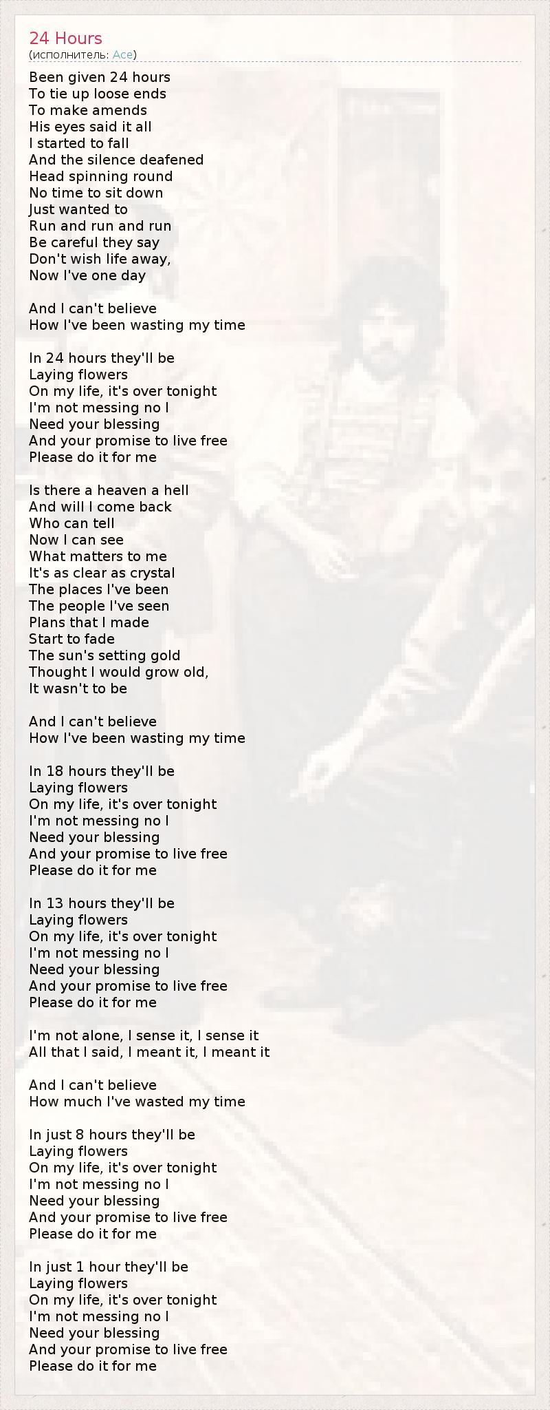 мне было дано 24 часа чтобы найти потерянные концы, покрыть причиненный ущерб его глаза сказали все я начала падать и тишина стала оглушать голова идет кругом, нет времени присесть, хотелось просто бежать,бежать и бежать они сказали-будь осторожна, не пропусти жизнь и теперь у меня один день и я не могу поверить как я бездарно тратила время через 24 часа они будут класть цветы на могилу моей жизни все закончится сегодня я не валяю дурака,нет мне нужно твое благословение ты обещал жить свободно так сделай это для меня есть ли рай или ад, и вернусь ли я когда -нибудь кто мне скажет? теперь я вижу что важно для меня все кристально ясно везде где я была, все кого я видела, планы, что я строила начали растворяться солнце зашло думала что я повзрослею, но не тут-то было и я не могу поверить как я убивала свое время через 18 часов положат цветы на могилу моей жизни сегодня все закончится но я не бездельничаю, нет,мне нужно твое благословение, ведь ты обещал жить свободно пожалуйста сделай это для меня через 13 часов они положат цветы на могилу моей жизни нет,я не бездействую, я жду твоих благословений и ты обещал свободно жить- сделай так для меня я не одна..я чуствую это..я чуствую что я сказала-то я и имела в виду поверить не могу как разбрасывалась своим временем через 8 часов сложат цветы на могилу моей жизни все закончится ночью я не валяю дурака,нет, мне нужно твое благоcловение обещал жить свободно- исполни это для меня еще час и они сложат цветы на могилу моей жизни она закончится через час я не бездействую, нет я жду твоего благословения ты обещал свободы- сделай это для меня пожалуйста...