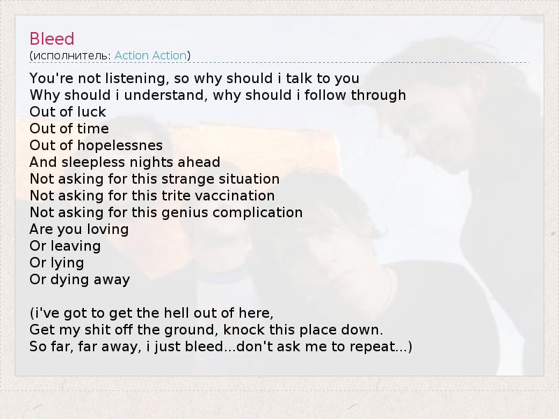 Это интересно:Коллектив был сформирован в 2004-ом году в Нью-Йорке. Среди основных стилей исполнения - такие как рок, альтернативный рок, инди-рок, новая волна и прочие.В состав коллектива Action Action входят музыканты Clarke Foley (вокал, бас-гитара), Adam Manning (гитара), Dan Leo (барабаны), а также - Mark Thomas Kluepfel (вокал, клавишные).До того, как коллектив собрался воедино, музыканты работали в иных коллективах - в Reunion Show,... продолжение