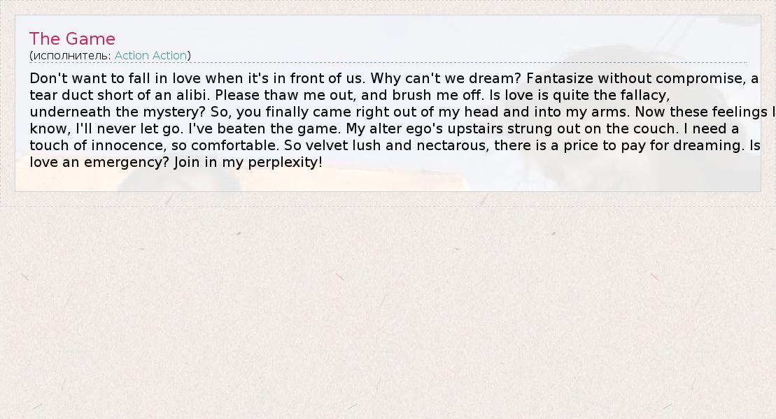 Don't want to fall in love when it's in front of us. Why can't we dream? Fantasize without compromise, a tear duct short of an alibi. Please thaw me out, and brush me off. Is love is quite the fallacy, underneath the mystery? So, you finally came right out of my head and into my arms. Now these feelings I know, I'll never let go. I've beaten the game. My alter ego's upstairs strung out on the couch. I need a touch of innocence, so comfortable. So velvet lush and nectarous, there is a price to pay for dreaming. Is love an emergency? Join in my perplexity!