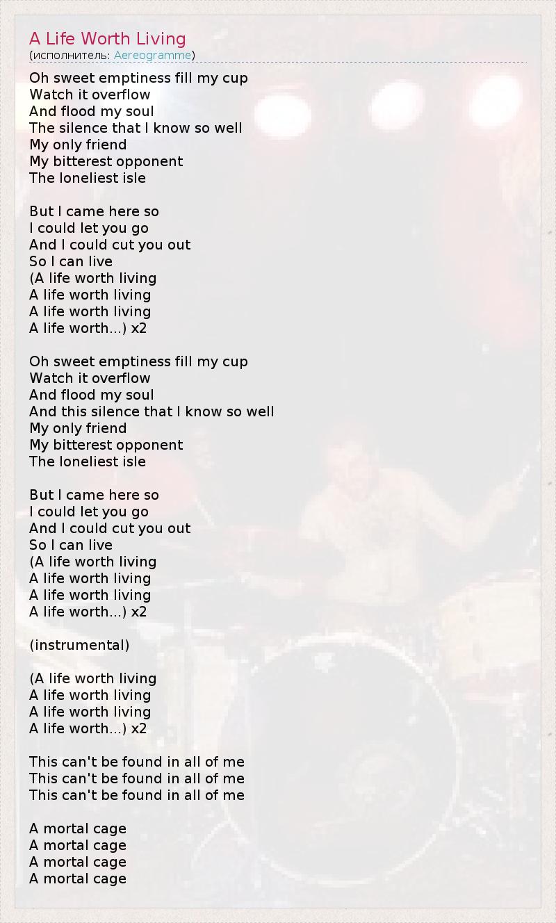 Oh sweet emptiness fill my cup Watch it overflow And flood my soul The silence that I know so well My only friend My bitterest opponent The loneliest isle But I came here so I could let you go And I could cut you out So I can live (A life worth living A life worth living A life worth living A life worth...) x2 Oh sweet emptiness fill my cup Watch it overflow And flood my soul And this silence that I know so well My only friend My bitterest opponent The loneliest isle But I came here so I could let you go And I could cut you out So I can live (A life worth living A life worth living A life worth living A life worth...) x2 (instrumental) (A life worth living A life worth living A life worth living A life worth...) x2 This can't be found in all of me This can't be found in all of me This can't be found in all of me A mortal cage A mortal cage A mortal cage A mortal cage