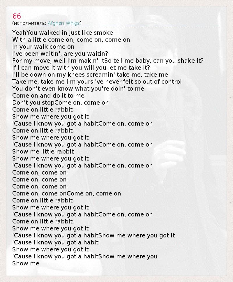 Это интересно:Afghan Whigs - американская альтернативная рок-группа. Образована в 1986 в Цинциннати (Огайо).Считается, что она принадлежит направлению гранж, но в ее музыке есть много традиционных течений: в альбоме «Uptown Avondale» присутствует много классических соул-мелодий, хотя в более раннем альбоме «Up In It» они исполняли роковые композиции в стиле кантри. Грег Далли (вокал, ритм-гитара), Рик Макколам... продолжение