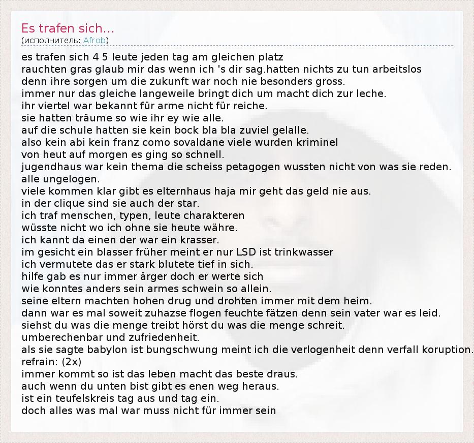 es trafen sich 4 5 leute jeden tag am gleichen platz rauchten gras glaub mir das wenn ich 's dir sag.hatten nichts zu tun arbeitslos denn ihre sorgen um die zukunft war noch nie besonders gross. immer nur das gleiche langeweile bringt dich um macht dich zur leche. ihr viertel war bekannt für arme nicht für reiche. sie hatten träume so wie ihr ey wie alle. auf die schule hatten sie kein bock bla bla zuviel gelalle. also kein abi kein franz como sovaldane viele wurden kriminel von heut auf morgen es ging so schnell. jugendhaus war kein thema die scheiss petagogen wussten nicht von was sie reden. alle ungelogen. viele kommen klar gibt es elternhaus haja mir geht das geld nie aus. in der clique sind sie auch der star. ich traf menschen, typen, leute charakteren wüsste nicht wo ich ohne sie heute währe. ich kannt da einen der war ein krasser. im gesicht ein blasser früher meint er nur LSD ist trinkwasser ich vermutete das er stark blutete tief in sich. hilfe gab es nur immer ärger doch er werte sich wie konntes anders sein armes schwein so allein. seine eltern machten hohen drug und drohten immer mit dem heim. dann war es mal soweit zuhazse flogen feuchte fätzen denn sein vater war es leid. siehst du was die menge treibt hörst du was die menge schreit. umberechenbar und zufriedenheit. als sie sagte babylon ist bungschwung meint ich die verlogenheit denn verfall koruption. refrain: (2x) immer kommt so ist das leben macht das beste draus. auch wenn du unten bist gibt es enen weg heraus. ist ein teufelskreis tag aus und tag ein. doch alles was mal war muss nicht für immer sein