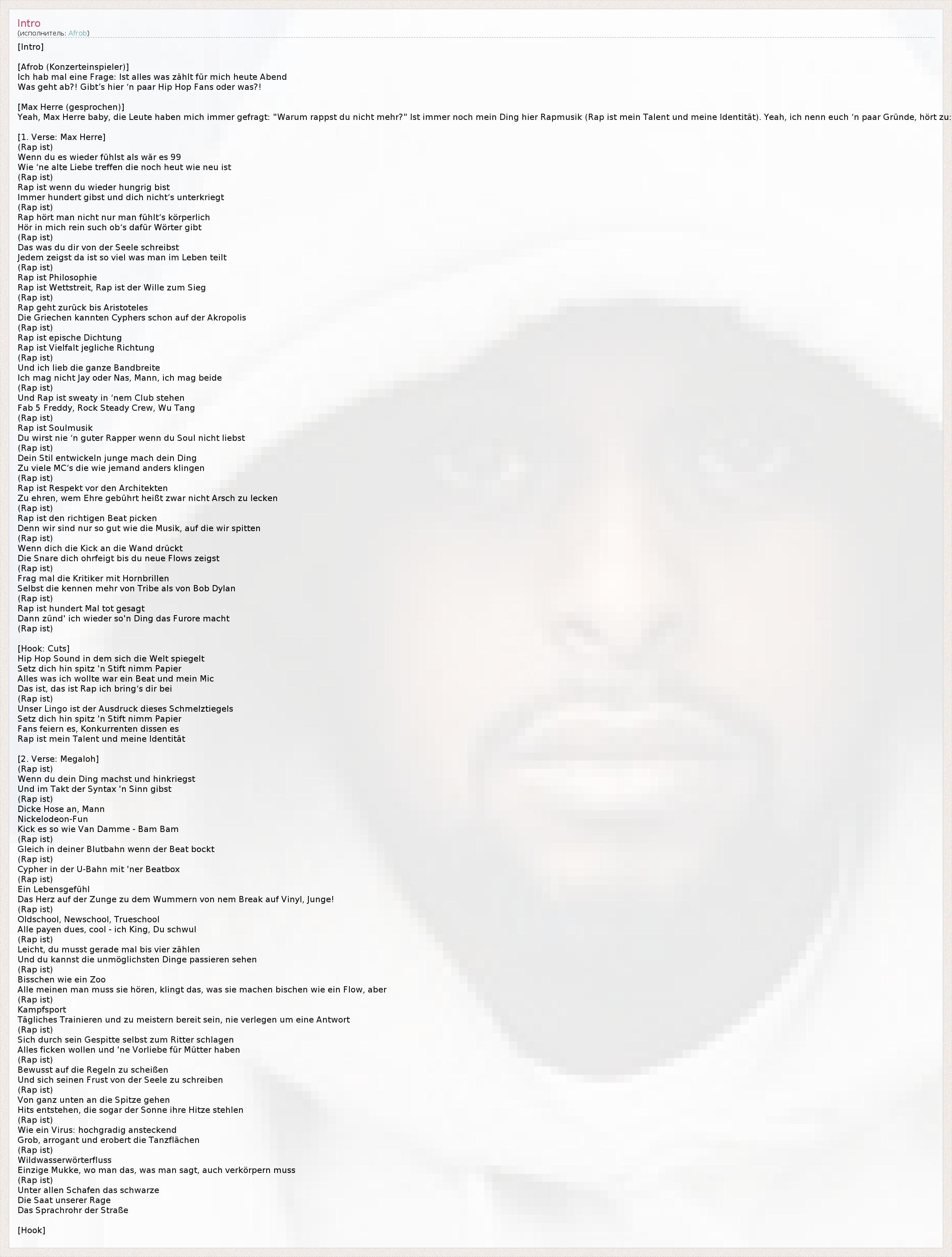 [Intro] [Afrob (Konzerteinspieler)] Ich hab mal eine Frage: Ist alles was zählt für mich heute Abend Was geht ab?! Gibt’s hier ‘n paar Hip Hop Fans oder was?! [Max Herre (gesprochen)] Yeah, Max Herre baby, die Leute haben mich immer gefragt: "Warum rappst du nicht mehr?" Ist immer noch mein Ding hier Rapmusik (Rap ist mein Talent und meine Identität). Yeah, ich nenn euch ‘n paar Gründe, hört zu: [1. Verse: Max Herre] (Rap ist) Wenn du es wieder fühlst als wär es 99 Wie ‘ne alte Liebe treffen die noch heut wie neu ist (Rap ist) Rap ist wenn du wieder hungrig bist Immer hundert gibst und dich nicht‘s unterkriegt (Rap ist) Rap hört man nicht nur man fühlt‘s körperlich Hör in mich rein such ob‘s dafür Wörter gibt (Rap ist) Das was du dir von der Seele schreibst Jedem zeigst da ist so viel was man im Leben teilt (Rap ist) Rap ist Philosophie Rap ist Wettstreit, Rap ist der Wille zum Sieg (Rap ist) Rap geht zurück bis Aristoteles Die Griechen kannten Cyphers schon auf der Akropolis (Rap ist) Rap ist epische Dichtung Rap ist Vielfalt jegliche Richtung (Rap ist) Und ich lieb die ganze Bandbreite Ich mag nicht Jay oder Nas, Mann, ich mag beide (Rap ist) Und Rap ist sweaty in ‘nem Club stehen Fab 5 Freddy, Rock Steady Crew, Wu Tang (Rap ist) Rap ist Soulmusik Du wirst nie ‘n guter Rapper wenn du Soul nicht liebst (Rap ist) Dein Stil entwickeln junge mach dein Ding Zu viele MC‘s die wie jemand anders klingen (Rap ist) Rap ist Respekt vor den Architekten Zu ehren, wem Ehre gebührt heißt zwar nicht Arsch zu lecken (Rap ist) Rap ist den richtigen Beat picken Denn wir sind nur so gut wie die Musik, auf die wir spitten (Rap ist) Wenn dich die Kick an die Wand drückt Die Snare dich ohrfeigt bis du neue Flows zeigst (Rap ist) Frag mal die Kritiker mit Hornbrillen Selbst die kennen mehr von Tribe als von Bob Dylan (Rap ist) Rap ist hundert Mal tot gesagt Dann zünd' ich wieder so'n Ding das Furore macht (Rap ist) [Hook: Cuts] Hip Hop Sound in dem sich die Welt spiegelt Setz dich hin spitz 'n Stift nimm Papier Alles was ich wollte war ein Beat und mein Mic Das ist, das ist Rap ich bring‘s dir bei (Rap ist) Unser Lingo ist der Ausdruck dieses Schmelztiegels Setz dich hin spitz 'n Stift nimm Papier Fans feiern es, Konkurrenten dissen es Rap ist mein Talent und meine Identität [2. Verse: Megaloh] (Rap ist) Wenn du dein Ding machst und hinkriegst Und im Takt der Syntax 'n Sinn gibst (Rap ist) Dicke Hose an, Mann Nickelodeon-Fun Kick es so wie Van Damme - Bam Bam (Rap ist) Gleich in deiner Blutbahn wenn der Beat bockt (Rap ist) Cypher in der U-Bahn mit 'ner Beatbox (Rap ist) Ein Lebensgefühl Das Herz auf der Zunge zu dem Wummern von nem Break auf Vinyl, Junge! (Rap ist) Oldschool, Newschool, Trueschool Alle payen dues, cool - ich King, Du schwul (Rap ist) Leicht, du musst gerade mal bis vier zählen Und du kannst die unmöglichsten Dinge passieren sehen (Rap ist) Bisschen wie ein Zoo Alle meinen man muss sie hören, klingt das, was sie machen bischen wie ein Flow, aber (Rap ist) Kampfsport Tägliches Trainieren und zu meistern bereit sein, nie verlegen um eine Antwort (Rap ist) Sich durch sein Gespitte selbst zum Ritter schlagen Alles ficken wollen und 'ne Vorliebe für Mütter haben (Rap ist) Bewusst auf die Regeln zu scheißen Und sich seinen Frust von der Seele zu schreiben (Rap ist) Von ganz unten an die Spitze gehen Hits entstehen, die sogar der Sonne ihre Hitze stehlen (Rap ist) Wie ein Virus: hochgradig ansteckend Grob, arrogant und erobert die Tanzflächen (Rap ist) Wildwasserwörterfluss Einzige Mukke, wo man das, was man sagt, auch verkörpern muss (Rap ist) Unter allen Schafen das schwarze Die Saat unserer Rage Das Sprachrohr der Straße [Hook]