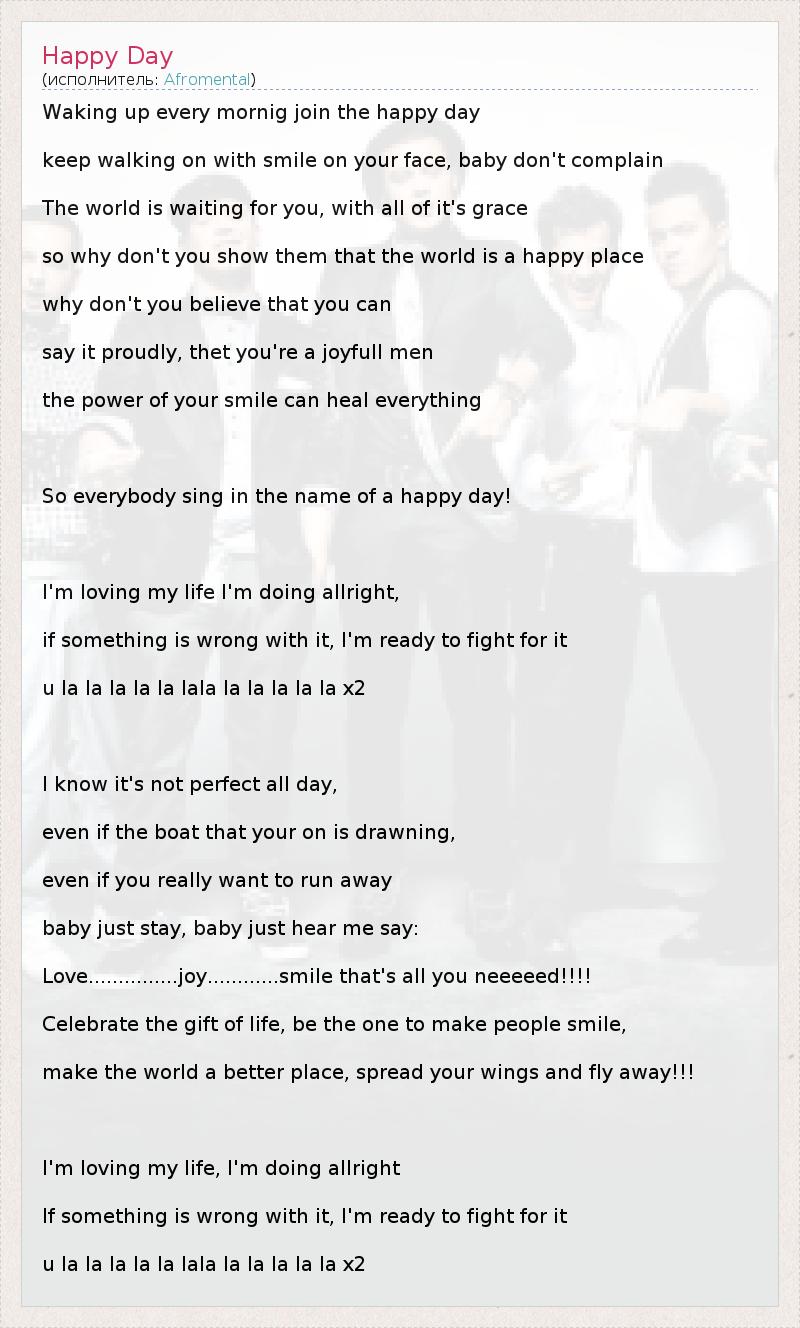 Waking up every mornig join the happy day keep walking on with smile on your face, baby don't complain The world is waiting for you, with all of it's grace so why don't you show them that the world is a happy place why don't you believe that you can say it proudly, thet you're a joyfull men the power of your smile can heal everything So everybody sing in the name of a happy day! I'm loving my life I'm doing allright, if something is wrong with it, I'm ready to fight for it u la la la la la lala la la la la la x2 I know it's not perfect all day, even if the boat that your on is drawning, even if you really want to run away baby just stay, baby just hear me say: Love...............joy............smile that's all you neeeeed!!!! Celebrate the gift of life, be the one to make people smile, make the world a better place, spread your wings and fly away!!! I'm loving my life, I'm doing allright If something is wrong with it, I'm ready to fight for it u la la la la la lala la la la la la x2