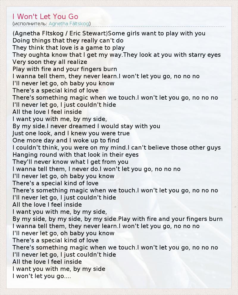 (Agnetha Fltskog / Eric Stewart)Some girls want to play with you Doing things that they really can't do They think that love is a game to play They oughta know that I get my way.They look at you with starry eyes Very soon they all realize Play with fire and your fingers burn I wanna tell them, they never learn.I won't let you go, no no no I'll never let go, oh baby you know There's a special kind of love There's something magic when we touch.I won't let you go, no no no I'll never let go, I just couldn't hide All the love I feel inside I want you with me, by my side, By my side.I never dreamed I would stay with you Just one look, and I knew you were true One more day and I woke up to find I couldn't think, you were on my mind.I can't believe those other guys Hanging round with that look in their eyes They'll never know what I get from you I wanna tell them, I never do.I won't let you go, no no no I'll never let go, oh baby you know There's a special kind of love There's something magic when we touch.I won't let you go, no no no I'll never let go, I just couldn't hide All the love I feel inside I want you with me, by my side, By my side, by my side, by my side.Play with fire and your fingers burn I wanna tell them, they never learn.I won't let you go, no no no I'll never let go, oh baby you know There's a special kind of love There's something magic when we touch.I won't let you go, no no no I'll never let go, I just couldn't hide All the love I feel inside I want you with me, by my side I won't let you go....