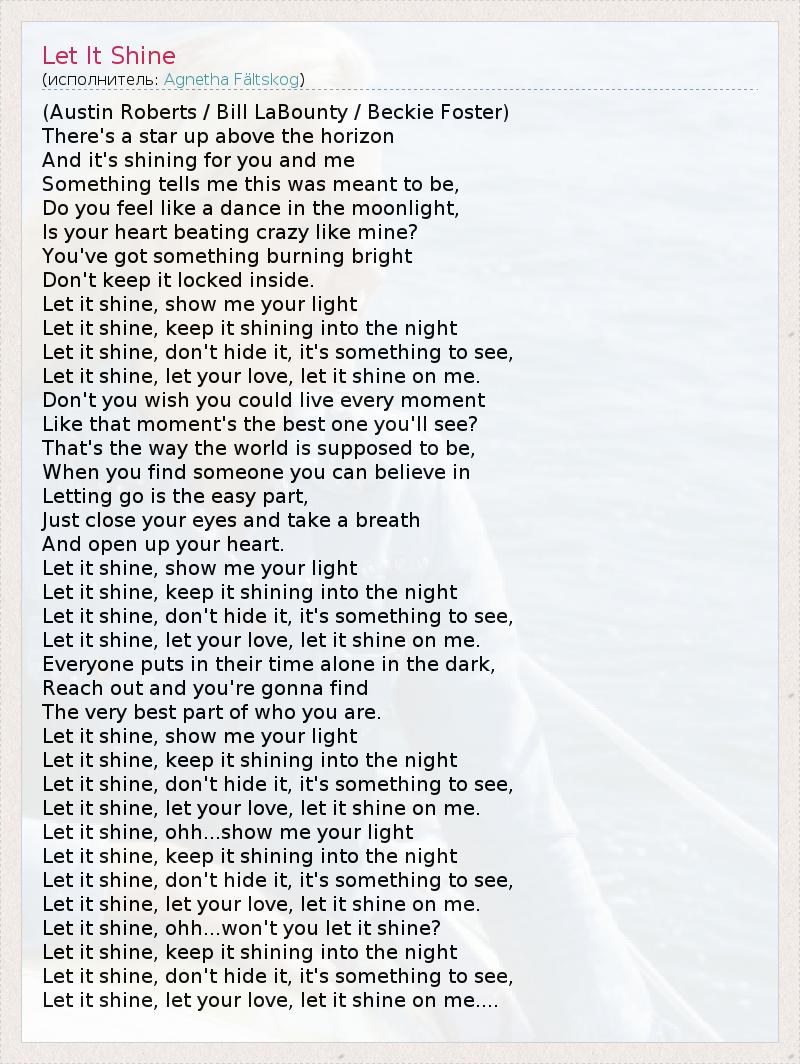(Austin Roberts / Bill LaBounty / Beckie Foster) There's a star up above the horizon And it's shining for you and me Something tells me this was meant to be, Do you feel like a dance in the moonlight, Is your heart beating crazy like mine? You've got something burning bright Don't keep it locked inside. Let it shine, show me your light Let it shine, keep it shining into the night Let it shine, don't hide it, it's something to see, Let it shine, let your love, let it shine on me. Don't you wish you could live every moment Like that moment's the best one you'll see? That's the way the world is supposed to be, When you find someone you can believe in Letting go is the easy part, Just close your eyes and take a breath And open up your heart. Let it shine, show me your light Let it shine, keep it shining into the night Let it shine, don't hide it, it's something to see, Let it shine, let your love, let it shine on me. Everyone puts in their time alone in the dark, Reach out and you're gonna find The very best part of who you are. Let it shine, show me your light Let it shine, keep it shining into the night Let it shine, don't hide it, it's something to see, Let it shine, let your love, let it shine on me. Let it shine, ohh...show me your light Let it shine, keep it shining into the night Let it shine, don't hide it, it's something to see, Let it shine, let your love, let it shine on me. Let it shine, ohh...won't you let it shine? Let it shine, keep it shining into the night Let it shine, don't hide it, it's something to see, Let it shine, let your love, let it shine on me....