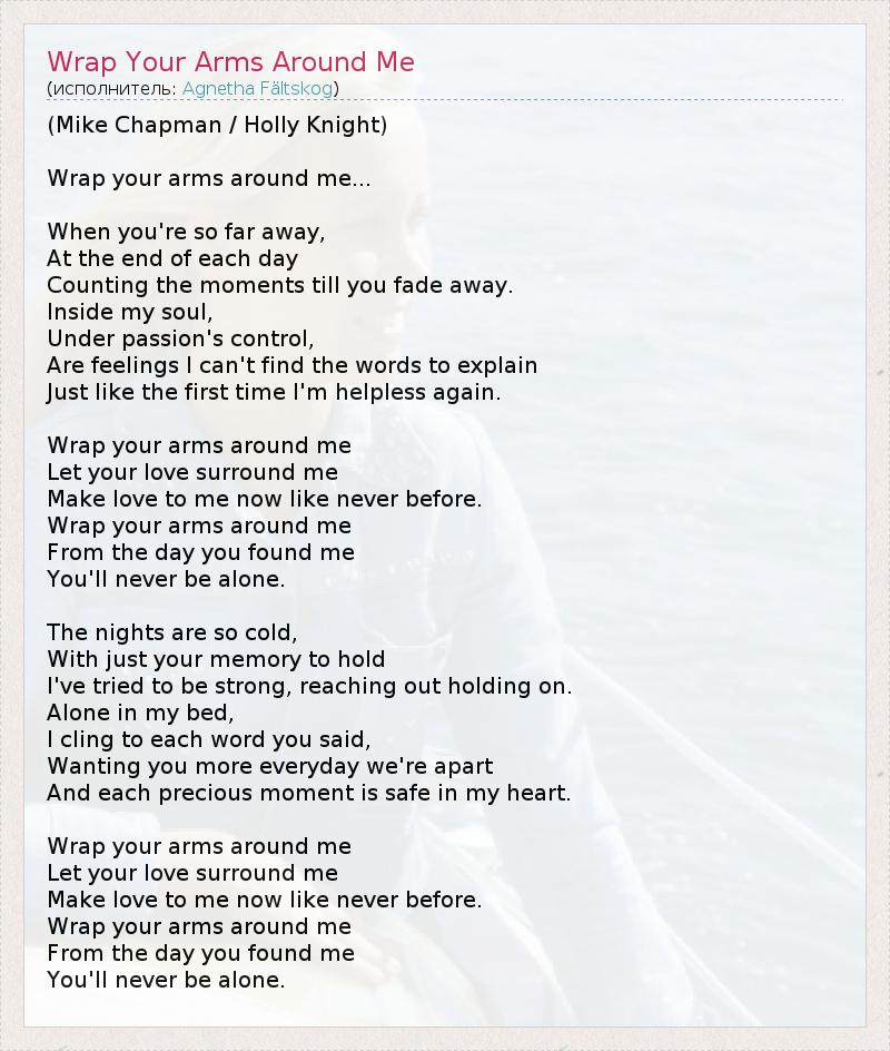 (Mike Chapman / Holly Knight) Wrap your arms around me... When you're so far away, At the end of each day Counting the moments till you fade away. Inside my soul, Under passion's control, Are feelings I can't find the words to explain Just like the first time I'm helpless again. Wrap your arms around me Let your love surround me Make love to me now like never before. Wrap your arms around me From the day you found me You'll never be alone. The nights are so cold, With just your memory to hold I've tried to be strong, reaching out holding on. Alone in my bed, I cling to each word you said, Wanting you more everyday we're apart And each precious moment is safe in my heart. Wrap your arms around me Let your love surround me Make love to me now like never before. Wrap your arms around me From the day you found me You'll never be alone.